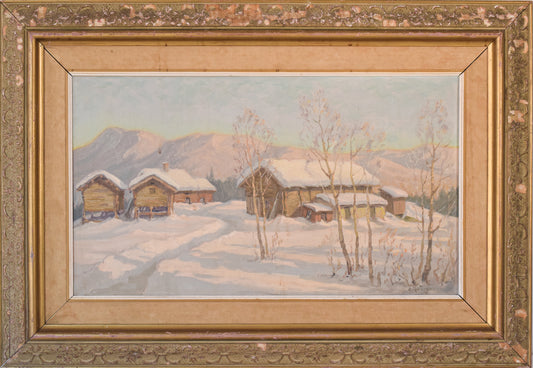 Port Scene with Fishing Boats and Mountains - Oil on board