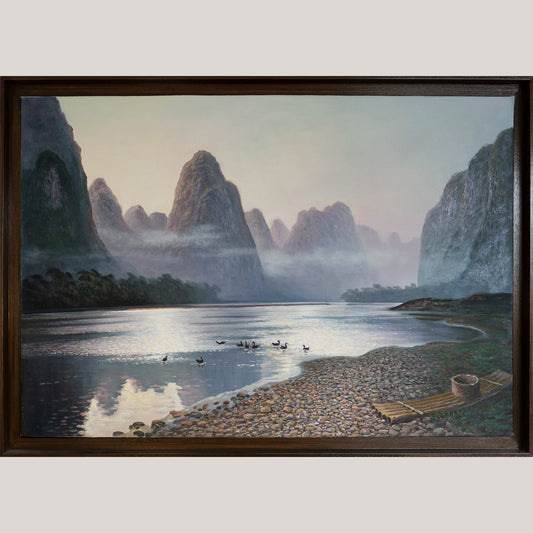 Tranquil Dawn on the Li River – Misty Karst Mountains – Oil on Canvas