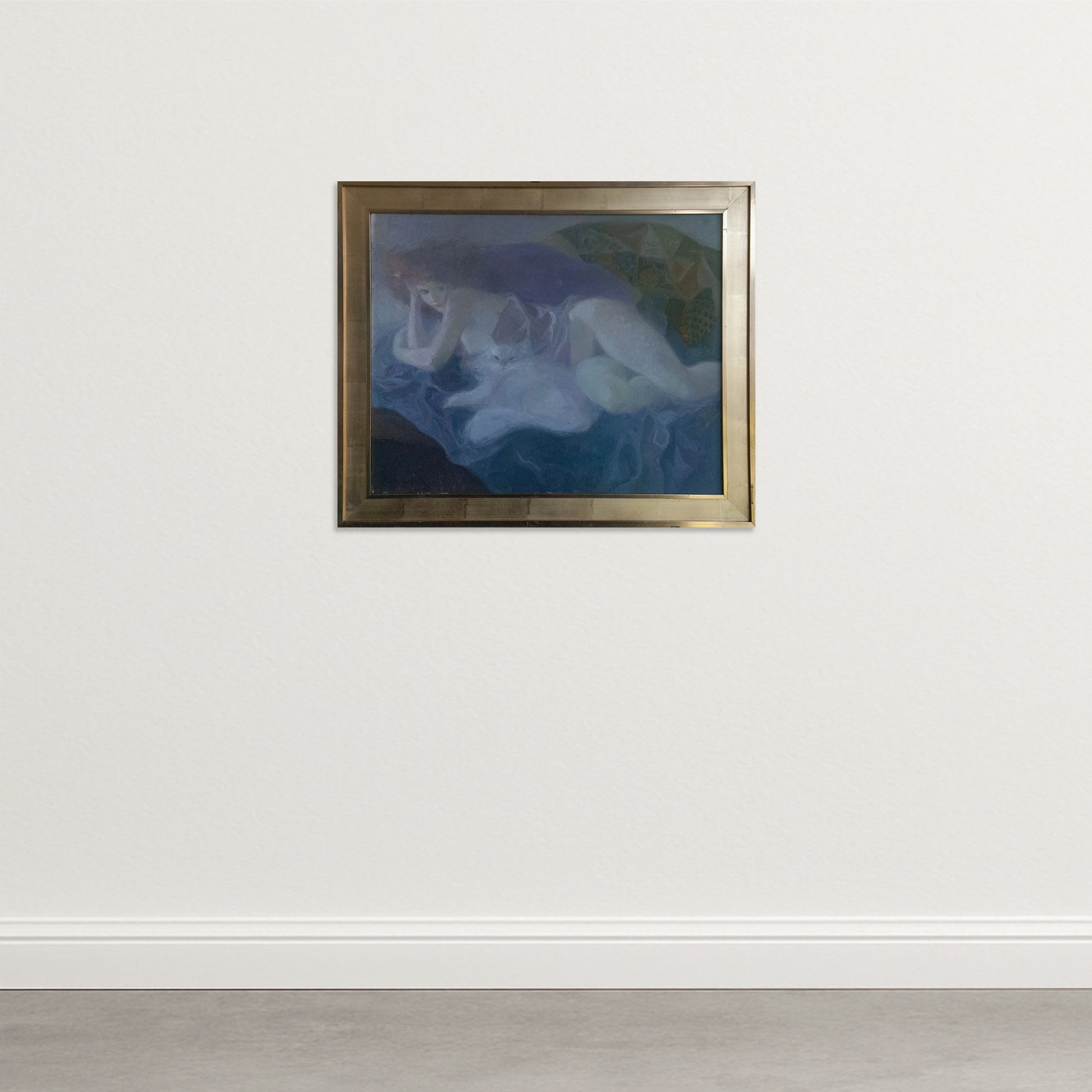 This refined composition by Emilia Castañeda Martínez presents a reclining female figure accompanied by a white cat, rendered in oil with her characteristic fusion of sensuality, dreamlike ambiance, and symbolic detail. The palette of violet, lavender, and cool blue tones creates an ethereal atmosphere, with soft transitions that emphasize the introspective mood of the scene. Her brushwork remains fluid and controlled, giving texture to drapery while allowing the figure and cat to emerge with subtle luminosity. The setting hints at symbolic narrative rather than a defined interior, a hallmark of her mature style. The visual balance between the languid pose, diffused lighting, and decorative motifs situates the work within her broader exploration of intimate psychological spaces.
