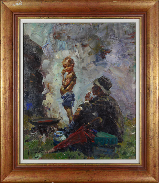 Josep Serra i Santa - Josep Serrasanta - Homme et garçon près d'un feu de camp