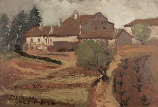 Peinture à l'huile pointilliste de paysage - Promenade au crépuscule dans l'oliveraie
