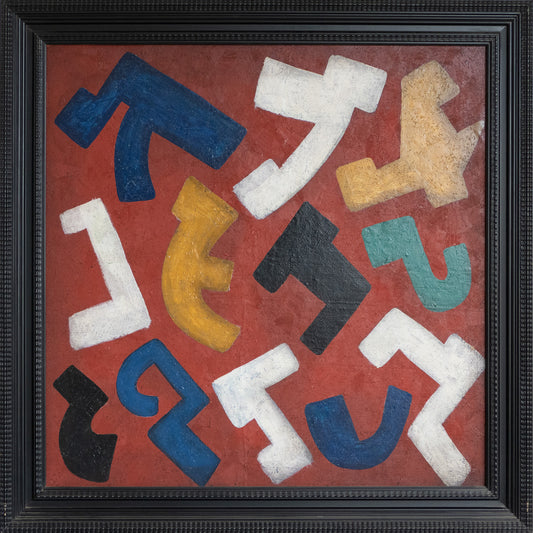 Rythmes constructifs sur fond rouge – Huile abstraite de Manuel Rufi Gibert (1931)