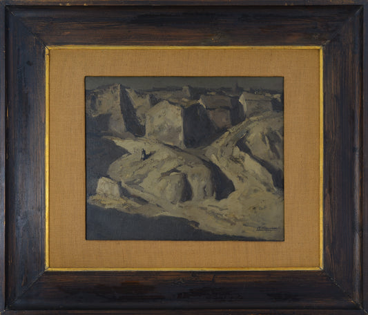 Village landscape with figure - Miguel Ángel Echauri (b. 1927, Pamplona, Spain)