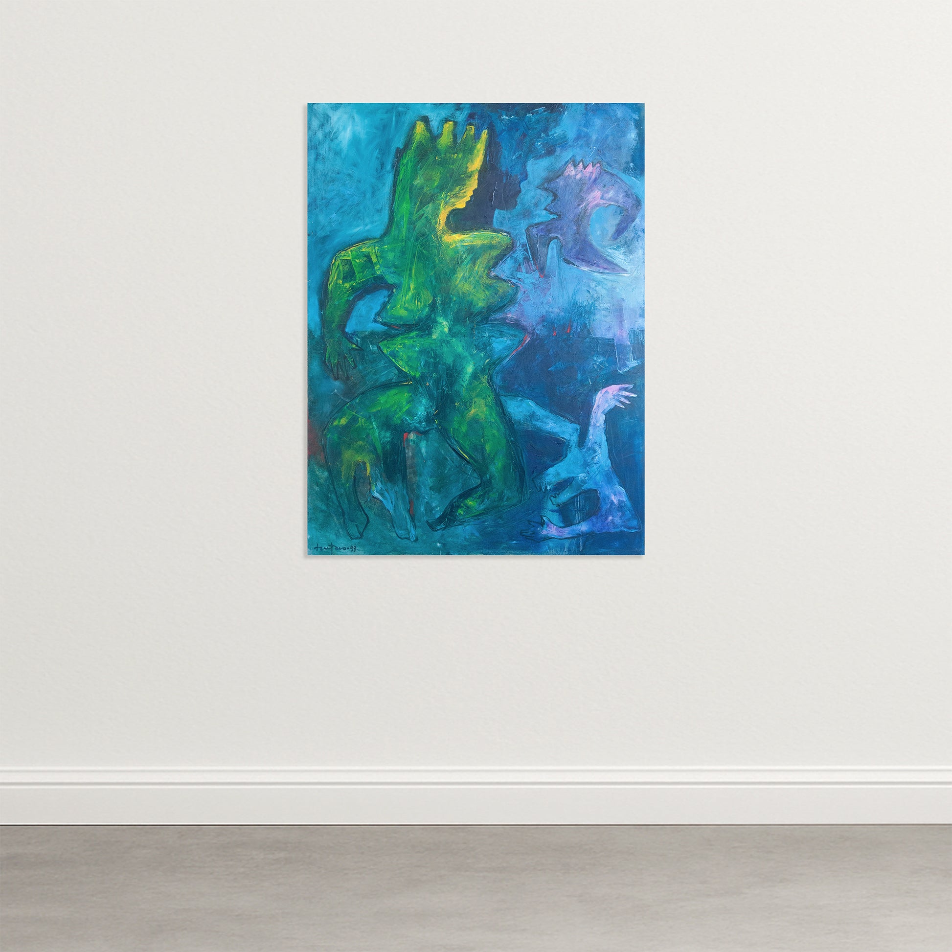 This expressive composition, signed and dated 1993, presents a dynamic arrangement of abstracted humanoid forms rendered in bold gestural strokes. The work employs a vivid palette dominated by saturated greens, deep blues, and flashes of yellow and violet, creating an energetic contrast that enhances the emotional charge of the scene. Layered brushwork, scraping marks, and textured passages give the surface a raw immediacy often associated with post-war European experimentation. The spatial tension between the central figure and the surrounding silhouettes evokes movement, conflict, and transformation, aligning strongly with the improvisational spirit of the Cobra movement. The interplay of light and shadow heightens the sense of depth, while the loose contours maintain a deliberately primitive, intuitive sensibility. The piece stands as a striking statement of mid-to-late 20th-century abstract figuration and would complement environments seeking a bold, expressive focal point.