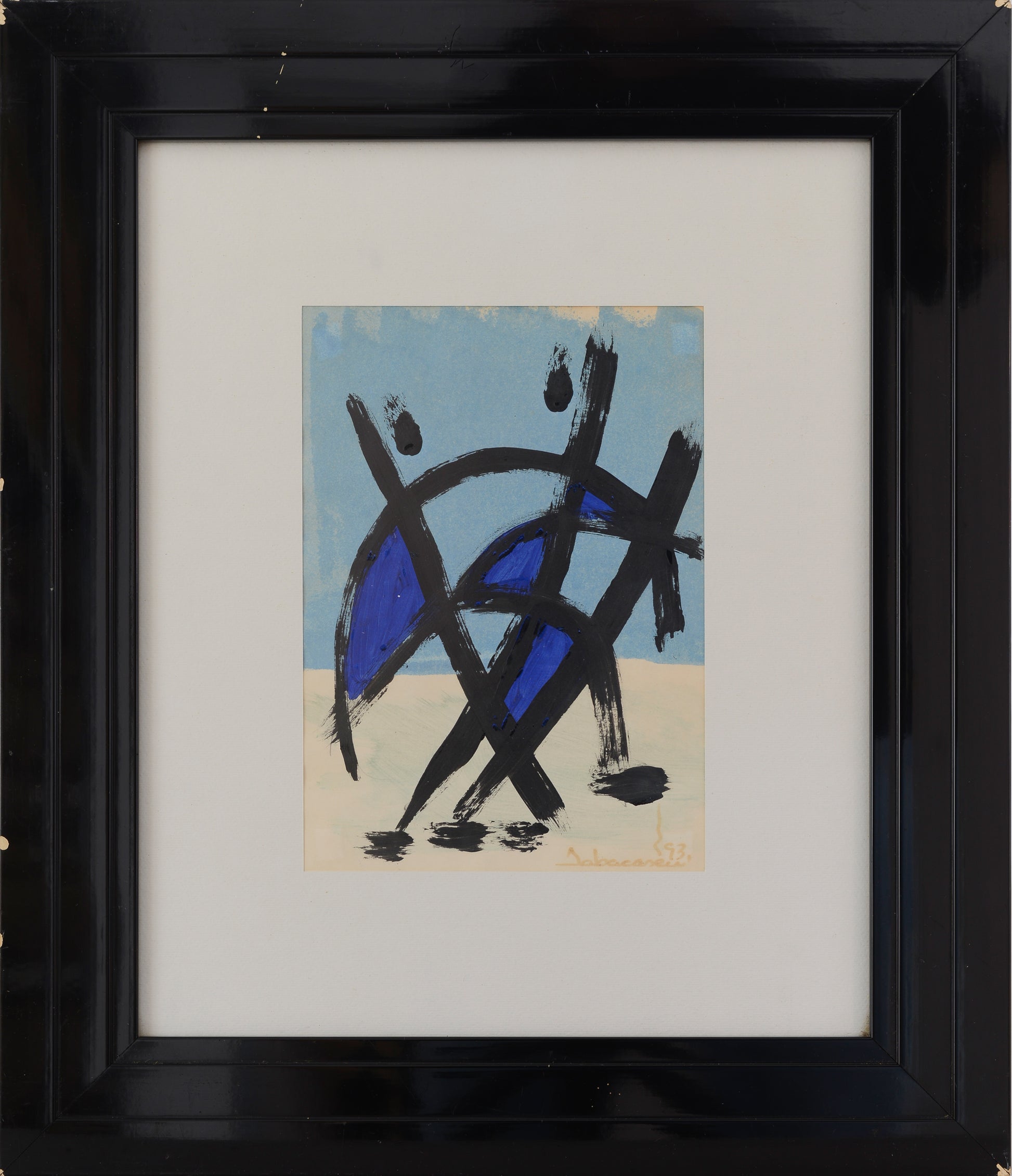 This expressive mixed-media work on paper by an unidentified artist presents a dynamic abstract figurative composition executed with confident, gestural brushwork. Bold black strokes define a loosely human form in motion, intersecting with saturated areas of deep cobalt blue that introduce rhythm and visual tension. The background is structured in soft horizontal bands of pale blue and warm cream, creating a sense of spatial grounding while allowing the central figure to remain dominant. The paint application is energetic and direct, with visible brush marks and intentional drips that reinforce the immediacy of the artist’s hand. Dated 1983, the work reflects the language of late 20th-century European abstraction, where figuration is reduced to essential movement and form. The composition balances spontaneity with control, resulting in a striking, modern presence well suited to contemporary and minimalist interiors.
