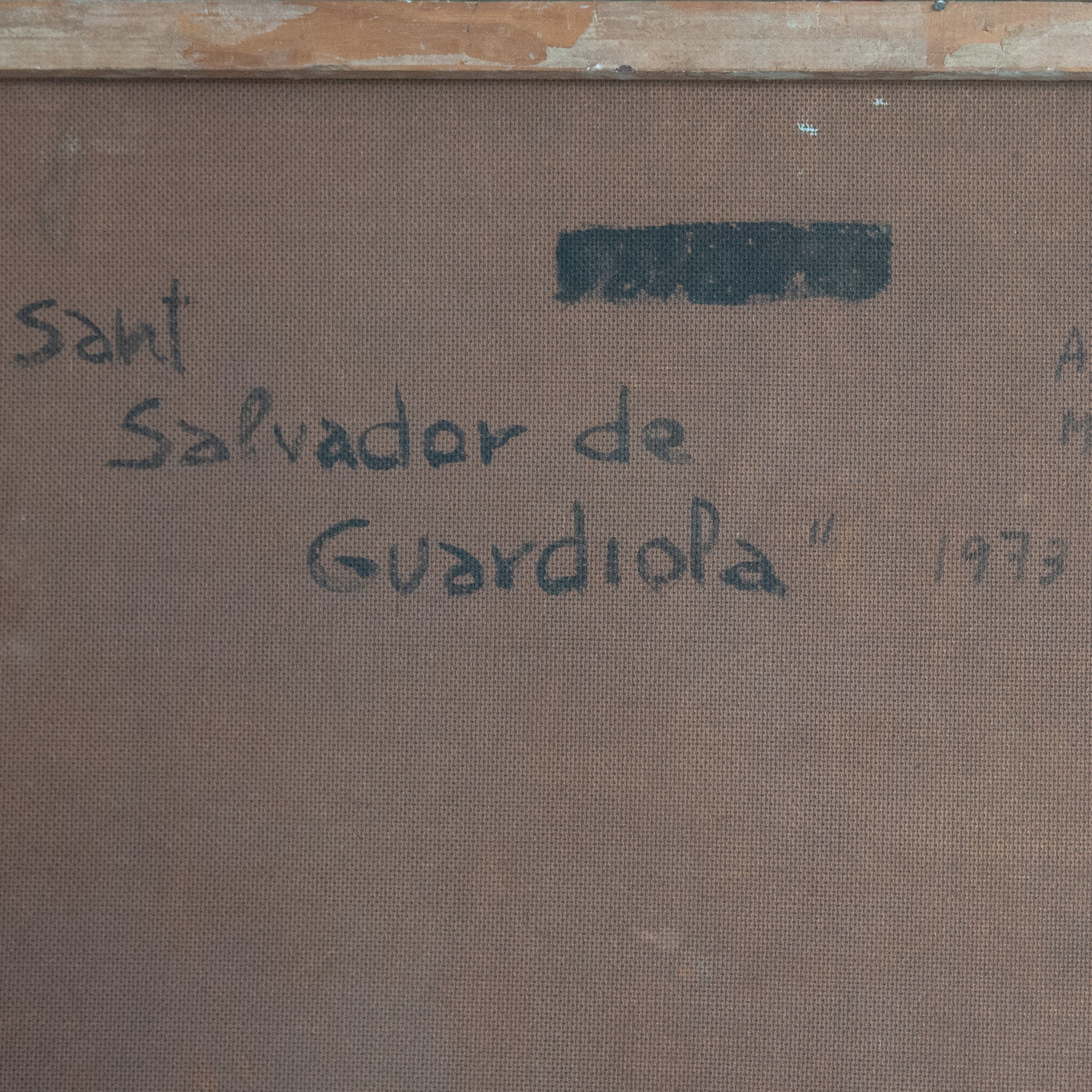 Antoni March’s Sant Salvador de Guardiola (1973) captures a luminous Catalan countryside beneath the distinctive silhouette of the Montserrat mountains. Executed with a vibrant, mosaic-like brushwork that merges Post-Impressionist structure with Fauvist color, the scene radiates both harmony and rhythm. Patches of soft yellows, greens, lilacs, and blues create a gently undulating field that leads the eye toward a cluster of rural houses, their terracotta roofs glowing under the Mediterranean light. The artist’s handling of paint—short, broken strokes and a thick impasto—reveals a confident control of tone and texture, balancing geometric precision with lyrical spontaneity. The overall mood is serene yet dynamic, suggesting both the order of cultivated land and the freedom of open air. This work perfectly embodies the Catalan modernist tradition of landscape painting, where light and color become the true subjects of the composition.