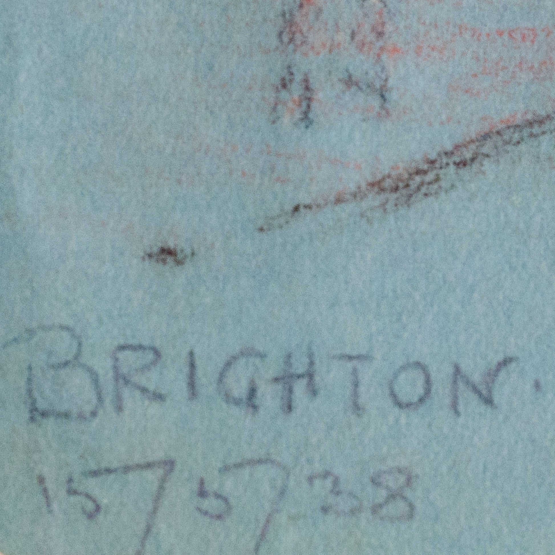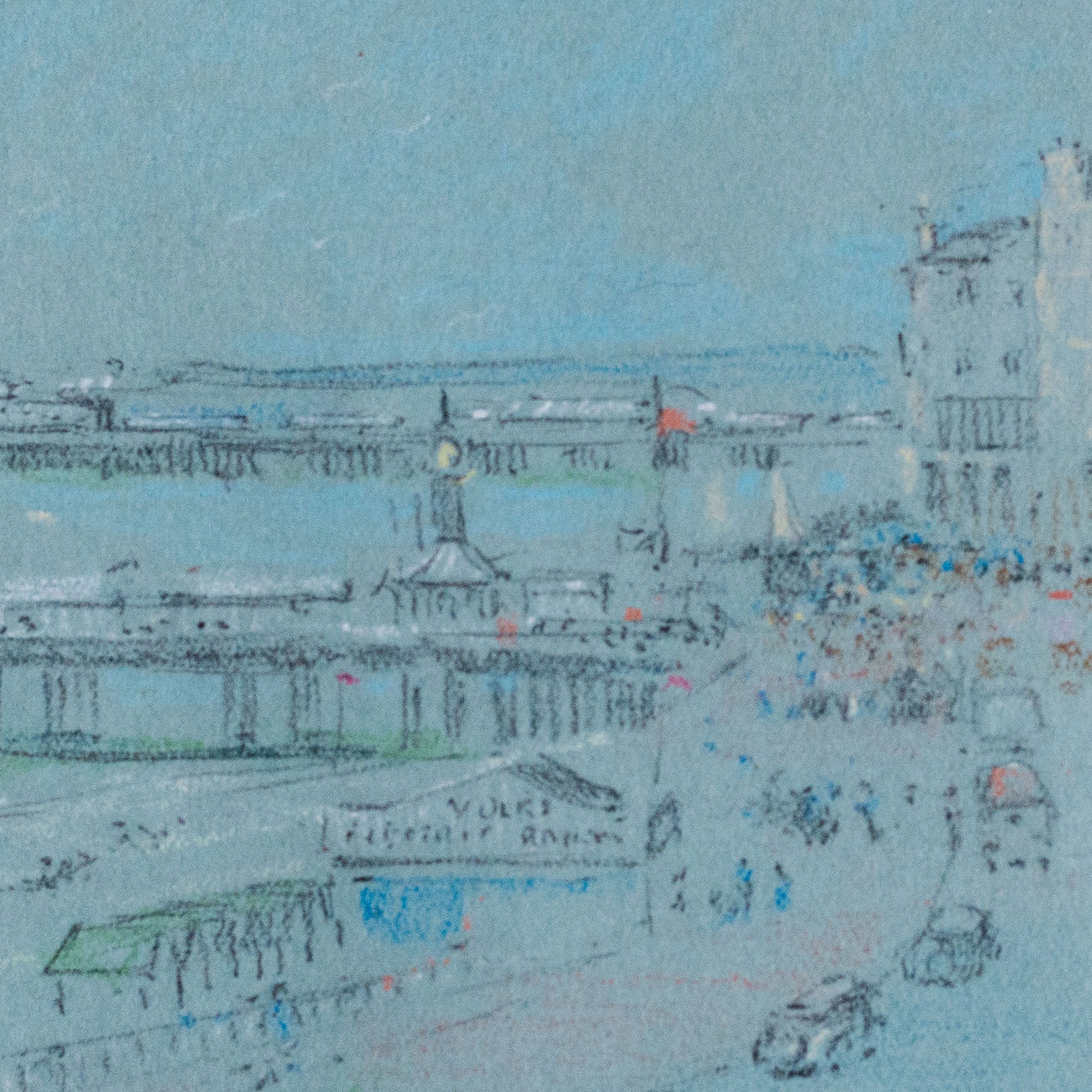 This original pencil sketch dated 1938 depicts the seafront at Brighton, England, with the Royal Albion Hotel and Brighton Pier rendered in fine, observational line work. The composition shows the lively promenade and roadway leading toward the waterfront, with cyclists, vehicles, and small figures captured through light, economical strokes that suggest movement and daily activity along the coast. Architectural details of the historic hotel and the pier extending over the sea are carefully outlined, while subtle touches of color and soft shading evoke the atmosphere of Brighton’s bustling seaside in the late 1930s. Penton Hook sketch on reverse.