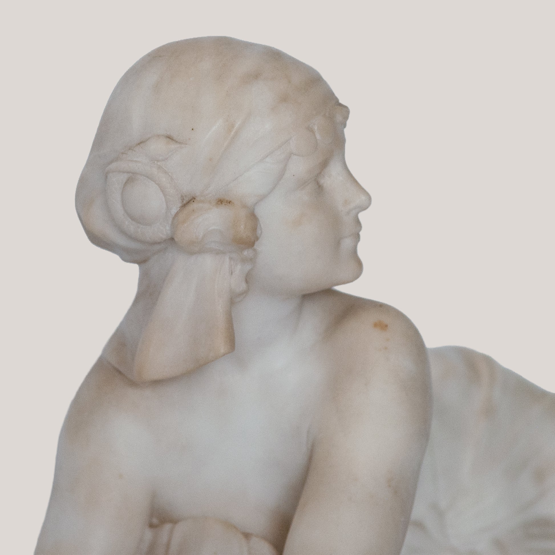 This finely carved sculpture by C. Cipriani presents a seated female figure poised on top a stylised mythical creature, executed in alabaster, possibly marble, with delicate modelling and refined classical details. The pale stone surface emphasises the soft transitions across the drapery, anatomical contours, and serene facial expression. Her extended arms and gentle twist of the torso create a dynamic yet balanced composition, while the stepped architectural base introduces a structured contrast to the fluid modelling above. The work reflects the early 20th-century Italian academic tradition, blending neoclassical elegance with romanticised genre elements. Its harmonious proportions and polished craftsmanship give the piece a distinguished presence well suited to sophisticated display environments.