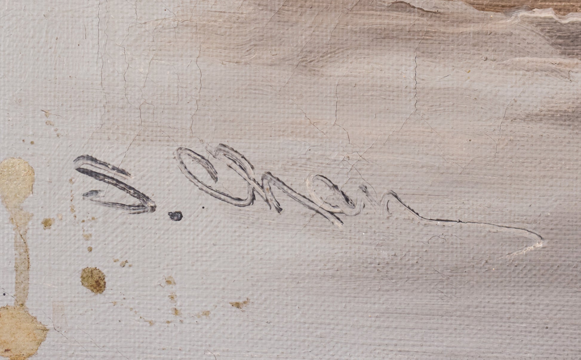 Painted by Chinese artist S. Chen, this finely executed oil portrait captures the dignified presence of an elderly fisherman wearing a traditional woven hat, rendered with remarkable emotional nuance. The artist’s skilled handling of natural light and muted tonal shifts evokes a quiet atmosphere, while the subject’s weathered face, with its etched lines and thoughtful gaze, becomes the focal point of the composition. Behind him, a delicately suggested riverboat scene, painted in soft sepia and ivory hues, fades into the background, offering a sense of place without detracting from the central figure. Whether painted in China or during a period spent working abroad—perhaps in Europe—the work reflects an academic realism with regional sensitivity and subtle narrative depth. The confident brushwork, earthy palette, and emotional realism suggest a mid-20th-century origin, when cross-cultural artistic exchanges were gaining ground. A striking, contemplative portrait that brings depth and cultural richness to any refined setting.