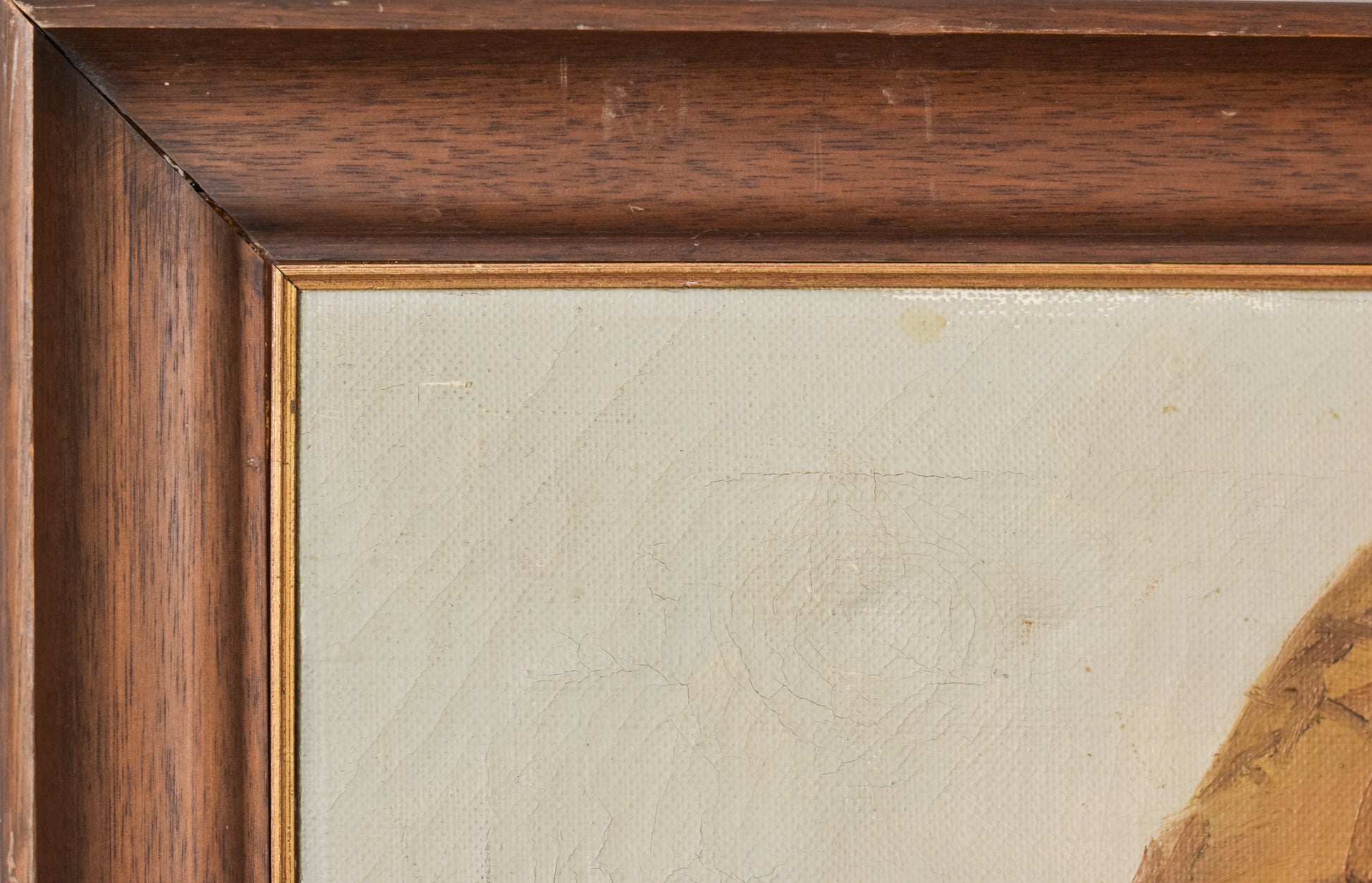 Presented in a solid wood frame with a warm walnut finish and gold inner trim; minor scuffing consistent with age enhances its vintage appeal.