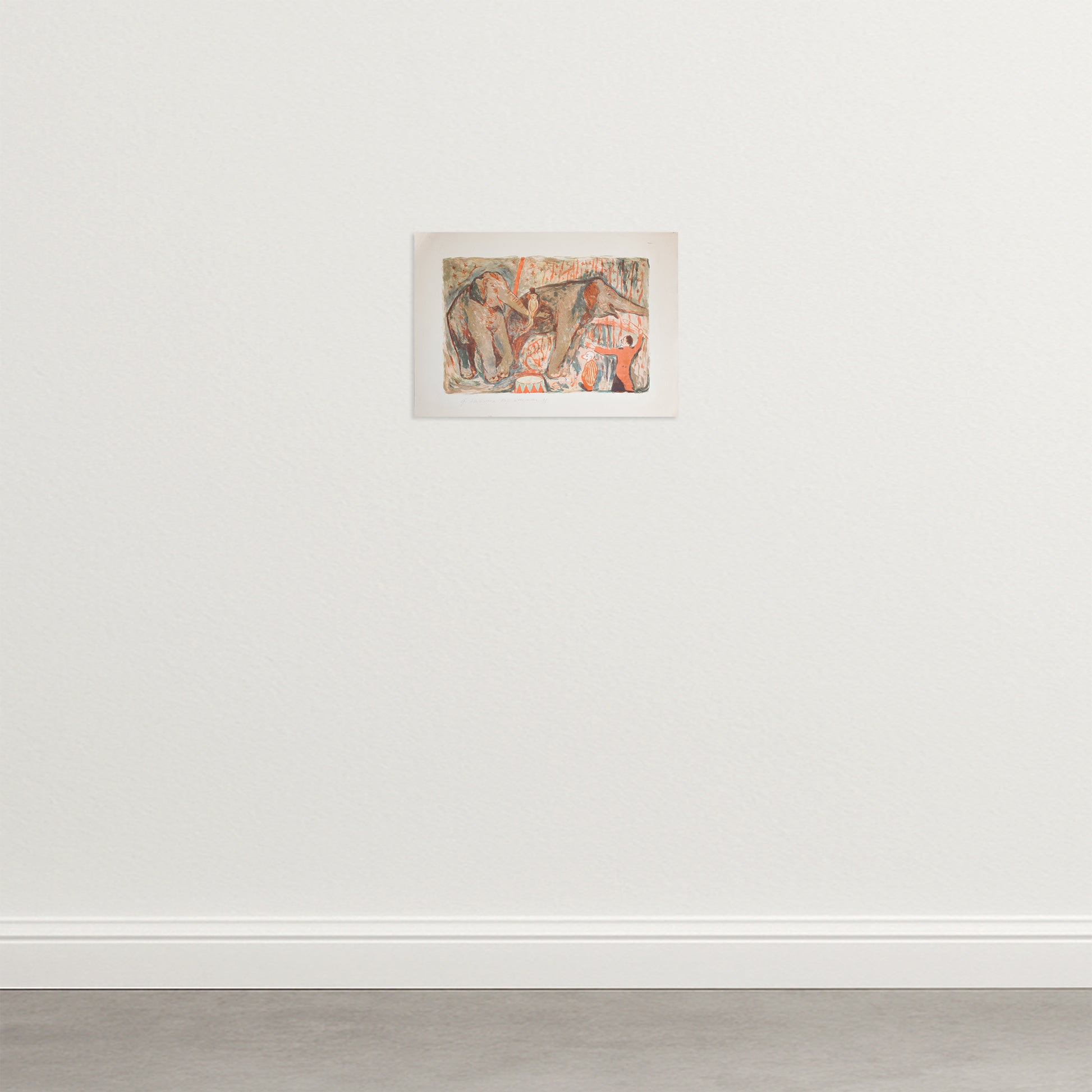 This original signed and numbered lithograph depicts a lively circus scene with two elephants performing inside a ring while a ringmaster and clown stand nearby observing the act. The composition is rendered in a limited palette of muted grey-blue and warm red tones, with expressive linework and layered lithographic textures creating movement and atmosphere within the performance setting. Stylized figures, simplified forms, and graphic contrasts reflect the character of mid-20th-century European figurative printmaking.