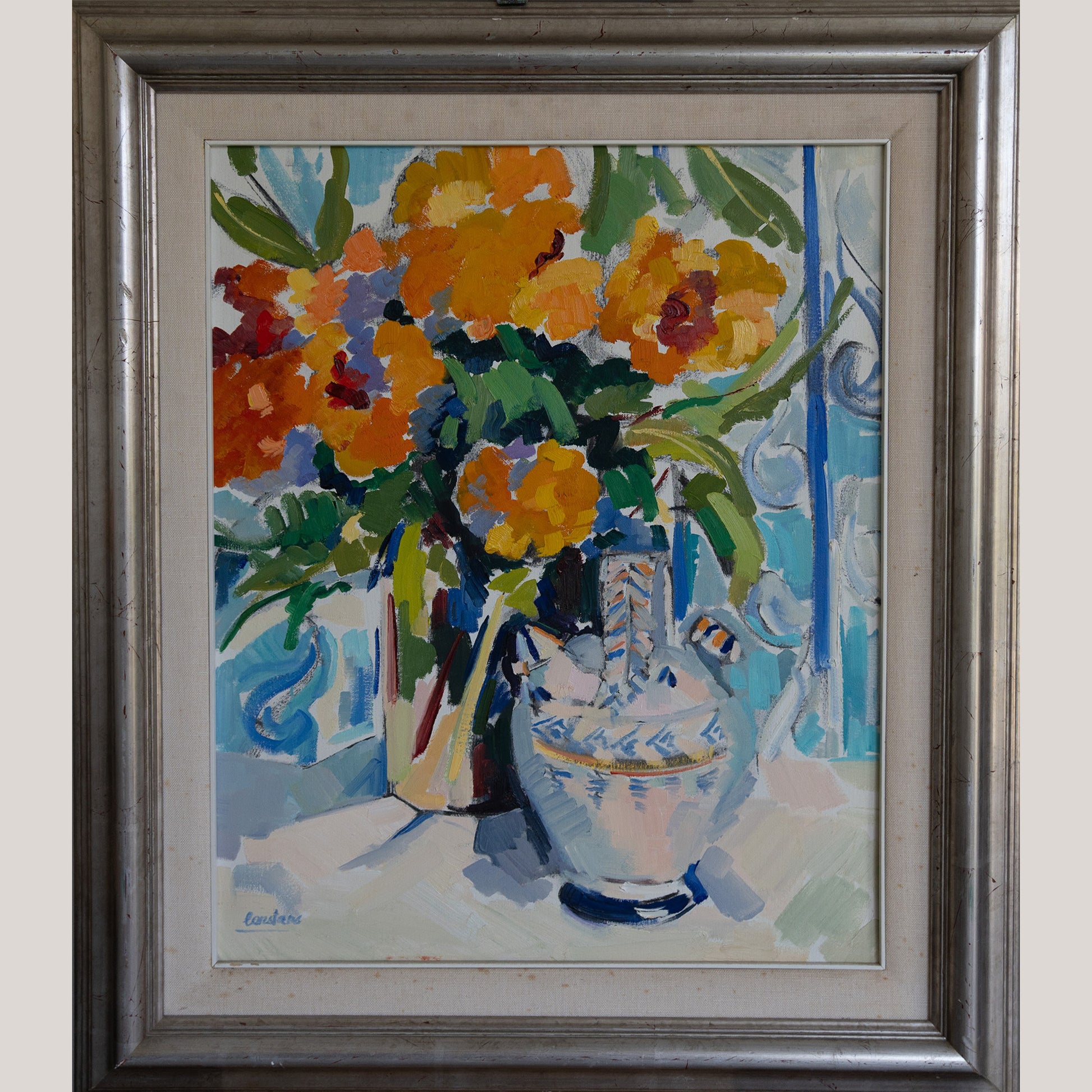 This radiant oil painting captures an exuberant still life brimming with expressive color and vitality. A vibrant bouquet of marigold and crimson blooms fills two contrasting vessels—a tall reflective pitcher and a robust white jar adorned with blue and ochre motifs. The background reveals a decorative wrought-iron pattern against a sunlit turquoise wall, evoking a Mediterranean veranda awash in light. Executed with bold, angular brushstrokes and rich impasto, the work embodies a synthesis of Fauvist exuberance and Post-Impressionist harmony. The painter’s dynamic handling of pigment emphasizes color as emotion, balancing vivid oranges and cobalt blues with soft lavender and pale peach tones. This composition radiates warmth and joy, transforming a simple floral subject into a celebration of light, texture, and form.