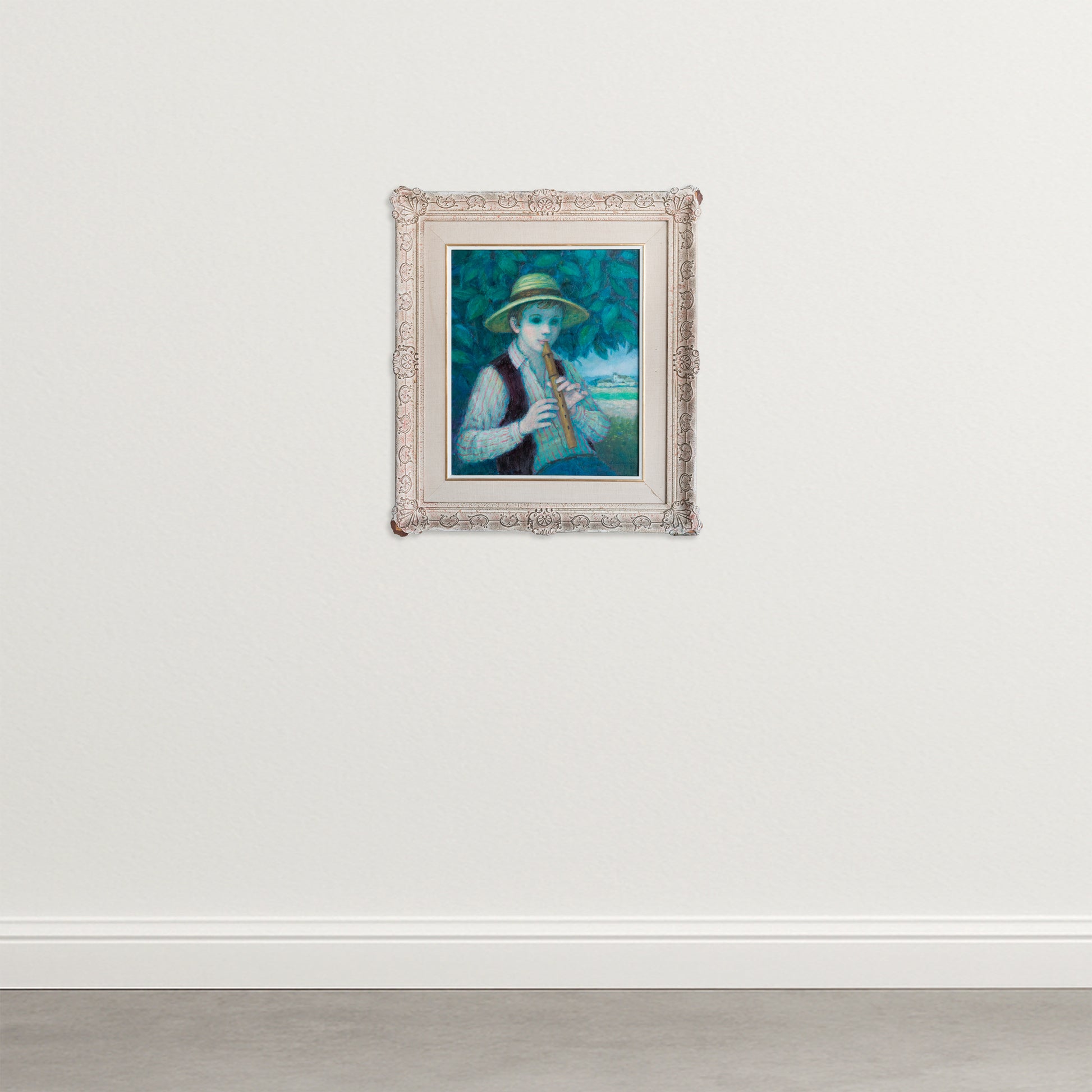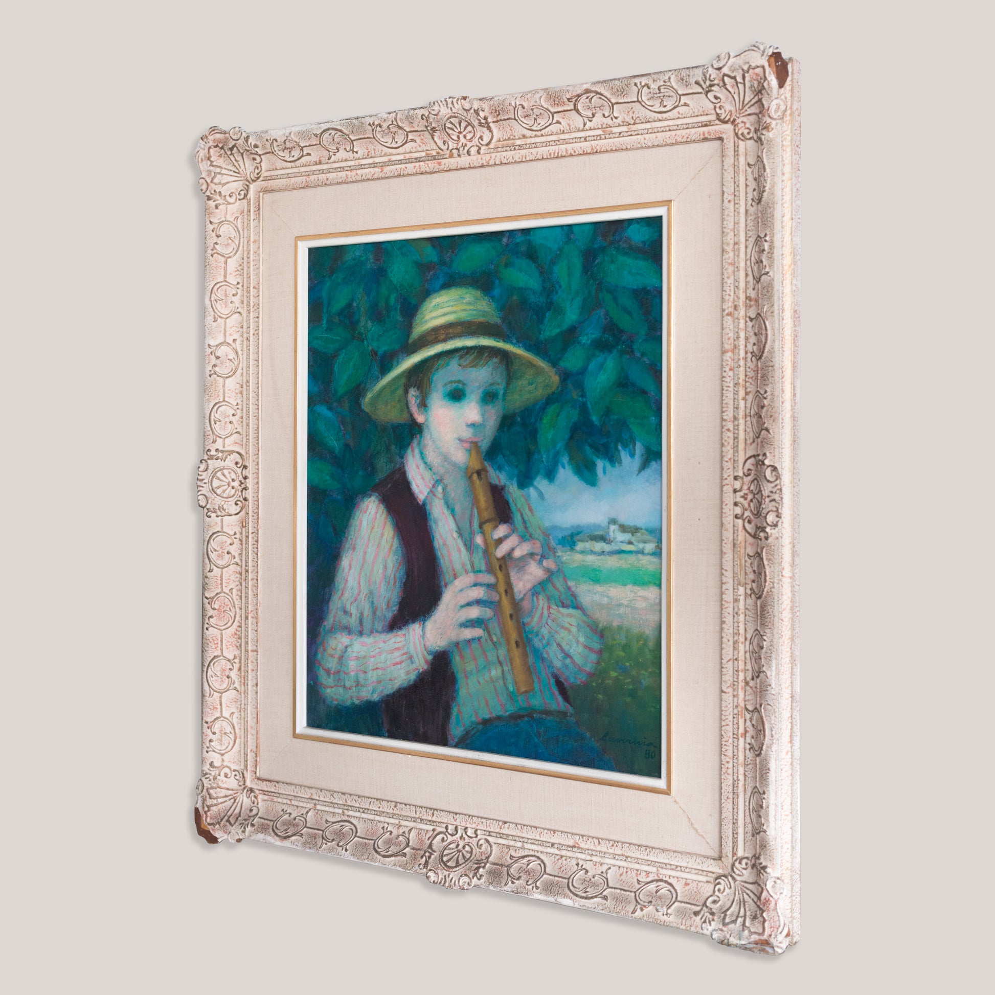 This oil on canvas depicts a young boy playing a pipe, set against a dense backdrop of foliage with a softly rendered landscape beyond. The composition centres on the seated figure, whose features are modelled with smooth tonal transitions, while the surrounding greenery is handled with more textured, expressive brushwork. A predominantly cool palette of greens and blues is balanced by warmer accents in the hat and instrument, reflecting characteristics associated with 20th-century figurative painting.