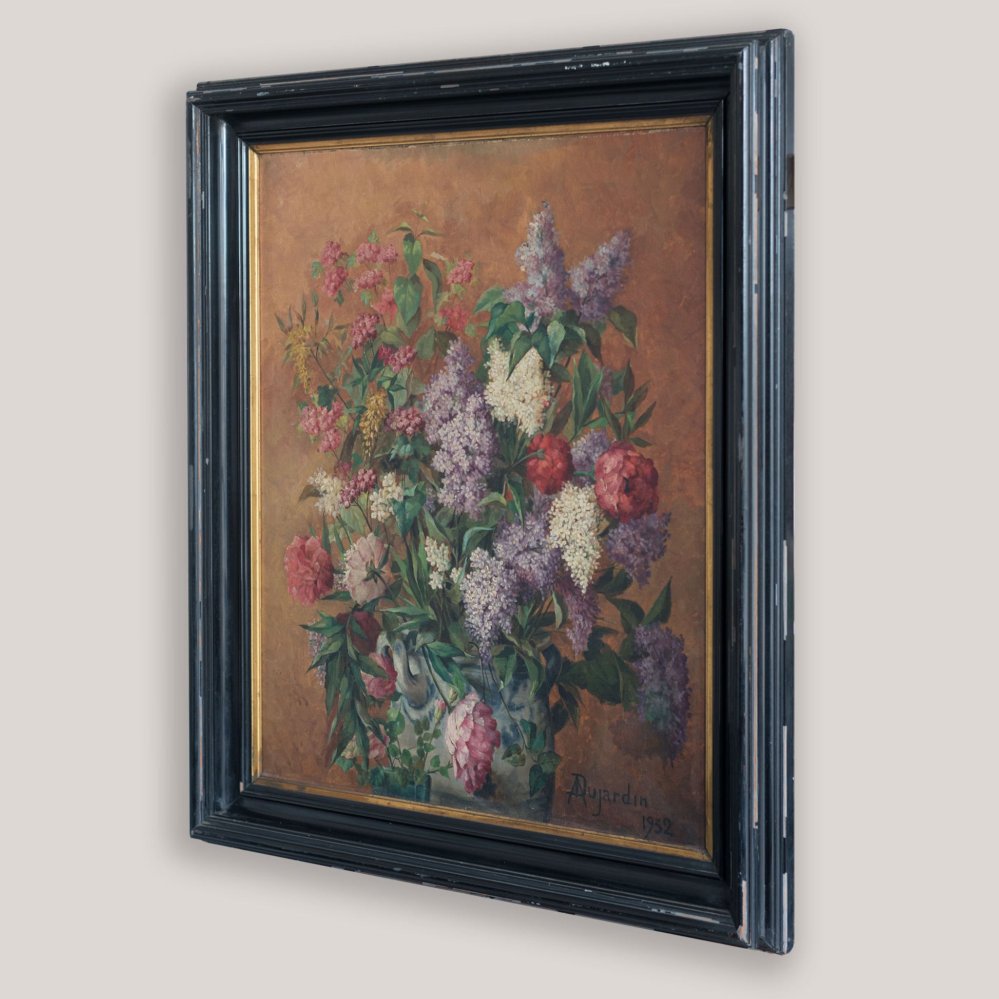 This 1932 oil painting presents a richly detailed floral still life arranged in a ceramic vase, rendered with careful naturalism and balanced composition. Lilac blossoms, peonies, and clustered garden flowers unfold across a warm, earthy background, their soft mauves, blush pinks, creamy whites, and deep greens creating a harmonious and layered palette. Controlled brushwork and subtle tonal transitions model the petals and foliage with depth, while gentle lighting draws attention to texture and volume without disrupting the calm symmetry of the arrangement. Rooted in nineteenth and early twentieth-century European still life tradition, the work reflects academic training and a sustained interest in botanical realism, offering a refined and timeless decorative presence.