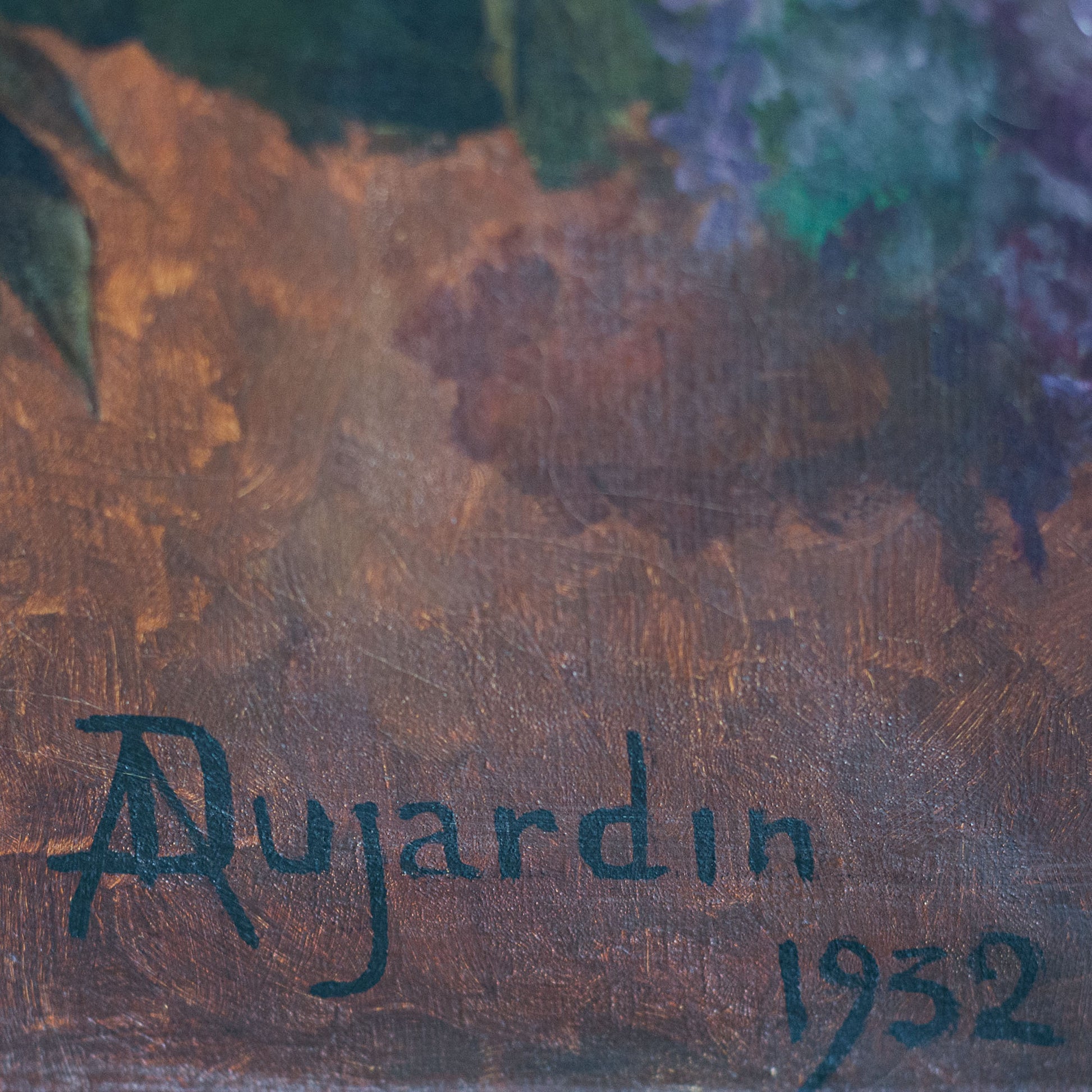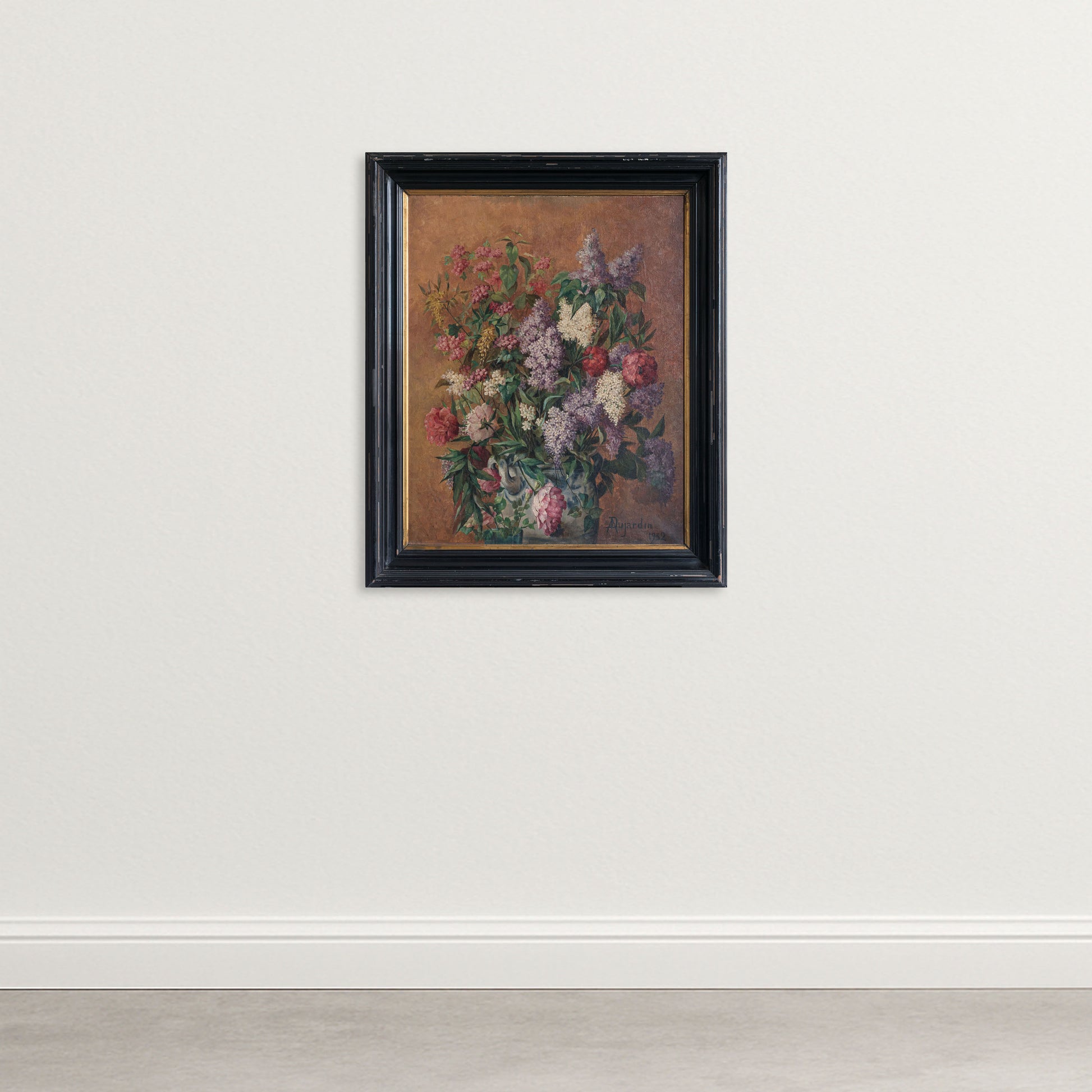 The artist Dujardin is unknown at present. The painting demonstrates strong academic influence, with disciplined composition, naturalistic colour harmony, and close observation of botanical form consistent with European studio practice of the late nineteenth and early twentieth century.