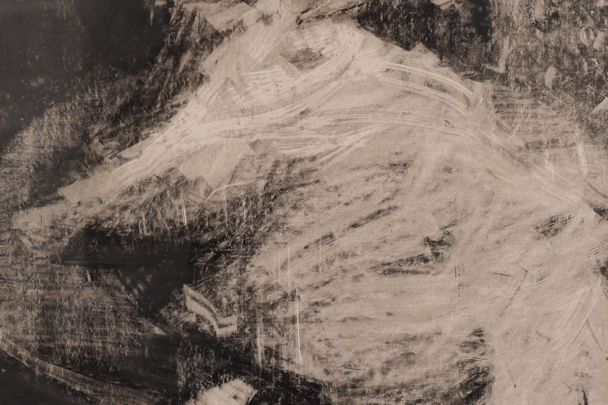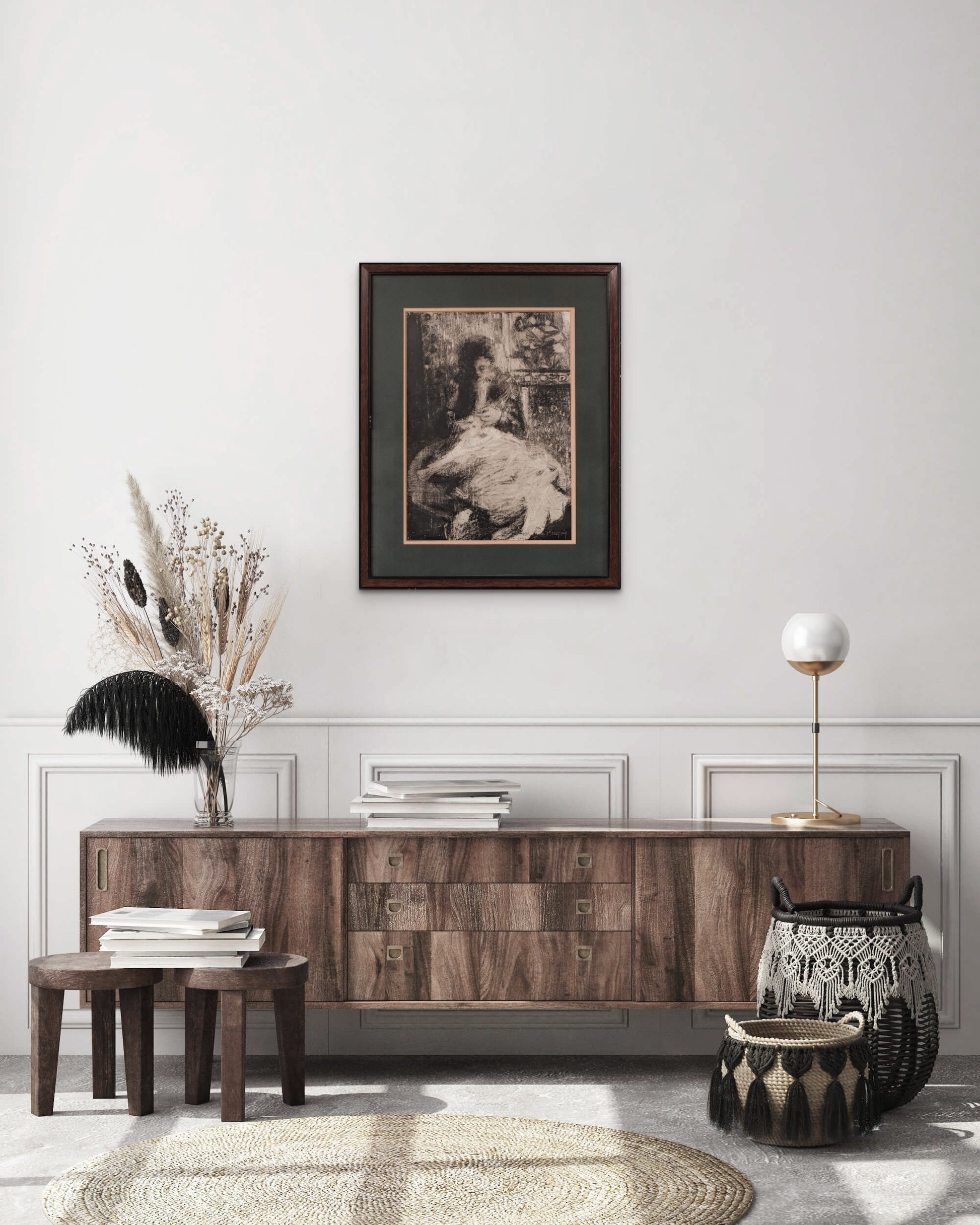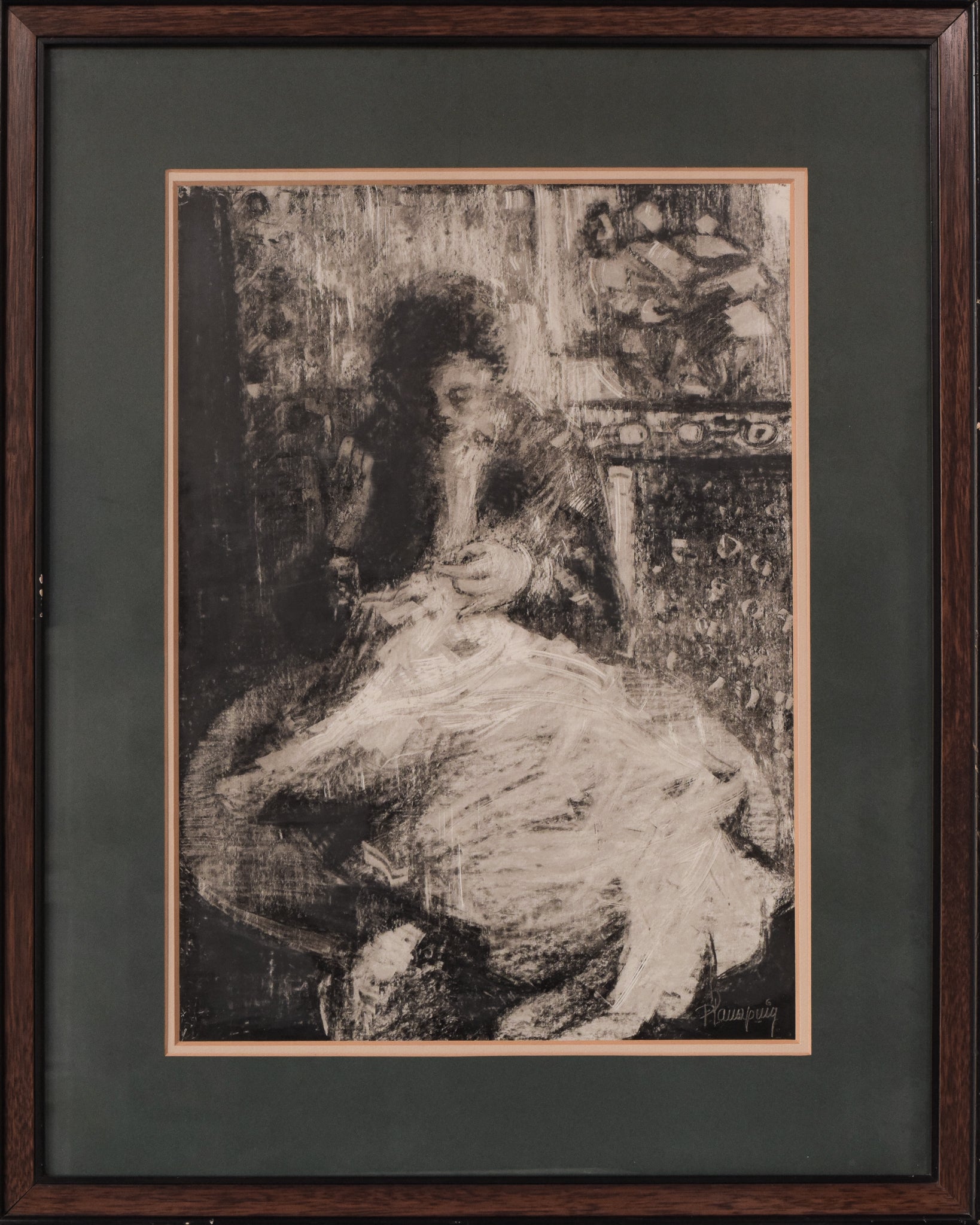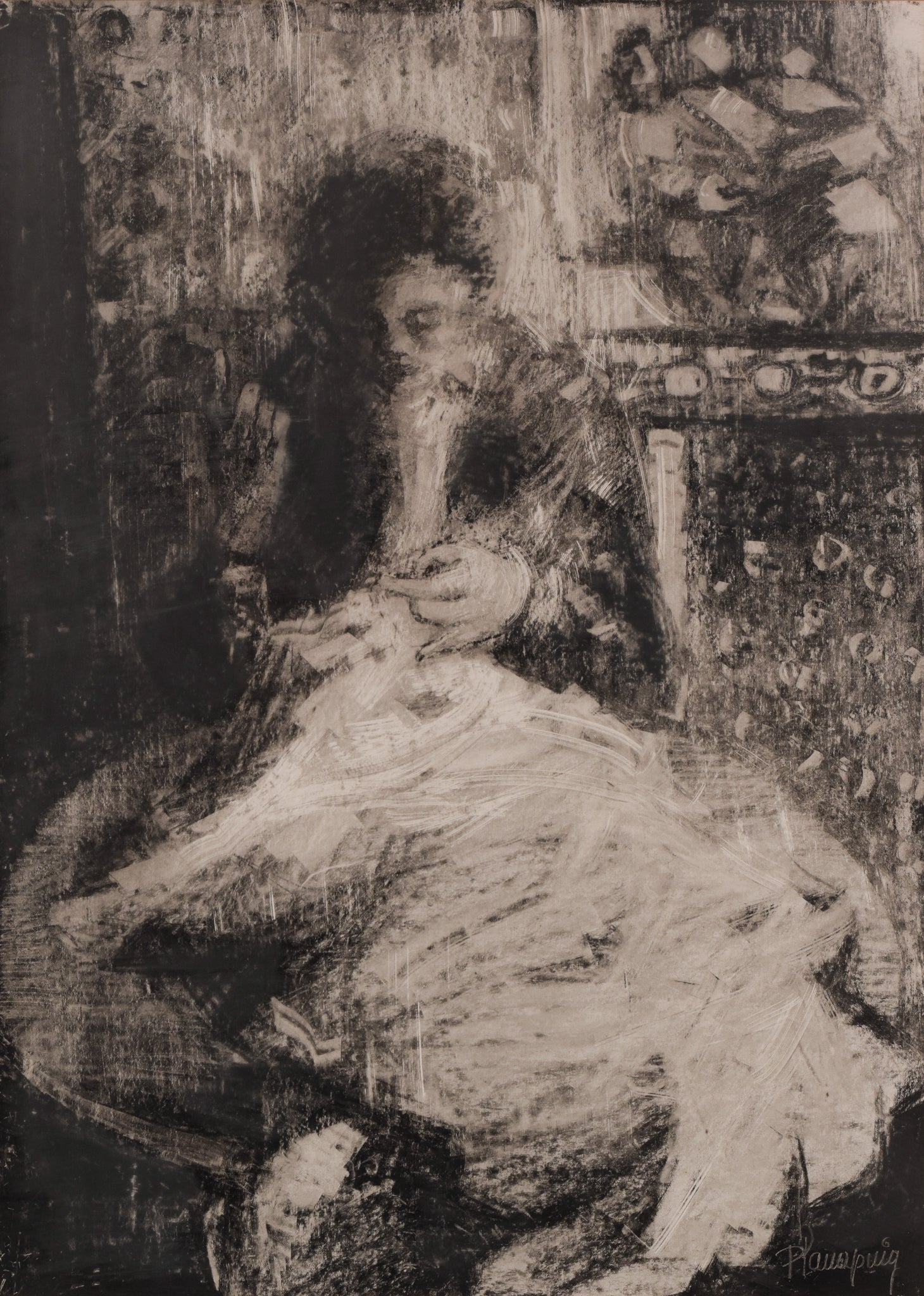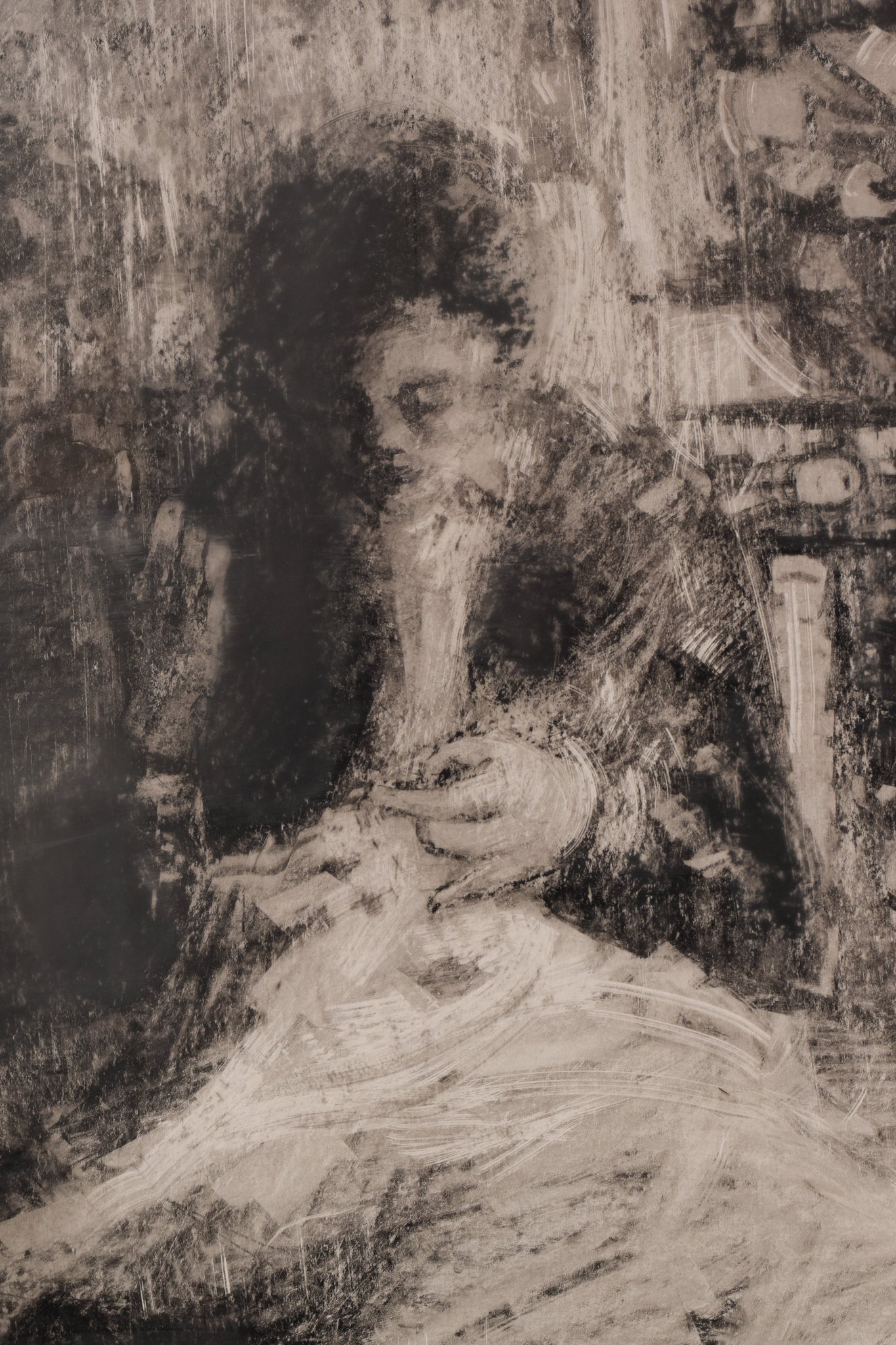 The hazy, monotone style of this atmospheric piece evokes a distant memory, washed out by the passing of decades how an old photograph fades with time. Depicted is a seated figure who appears to be sewing a piece of cloth. In this shadowy space, the artist gives us hints at details whilst leaving the story to the imagination.