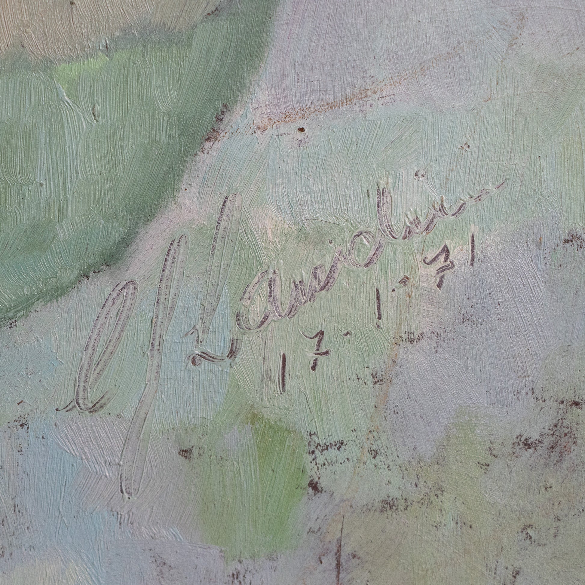 This elegant Impressionist oil on board, painted in 1971, depicts a graceful floral arrangement in a white vase set against a softly blended green background. The composition exudes serenity through its delicate palette of mint greens, rose pinks, and pale lilacs, subtly balanced by the cool tones of the table beneath. Loose yet deliberate brushwork captures the fleeting beauty of light and color, lending the scene a poetic, dreamlike quality. The artist’s technique evokes the quiet lyricism of mid-20th-century European still life painting, where atmosphere and tonal balance take precedence over detail. The result is a refined and contemplative work that brings warmth, elegance, and understated sophistication to any interior.