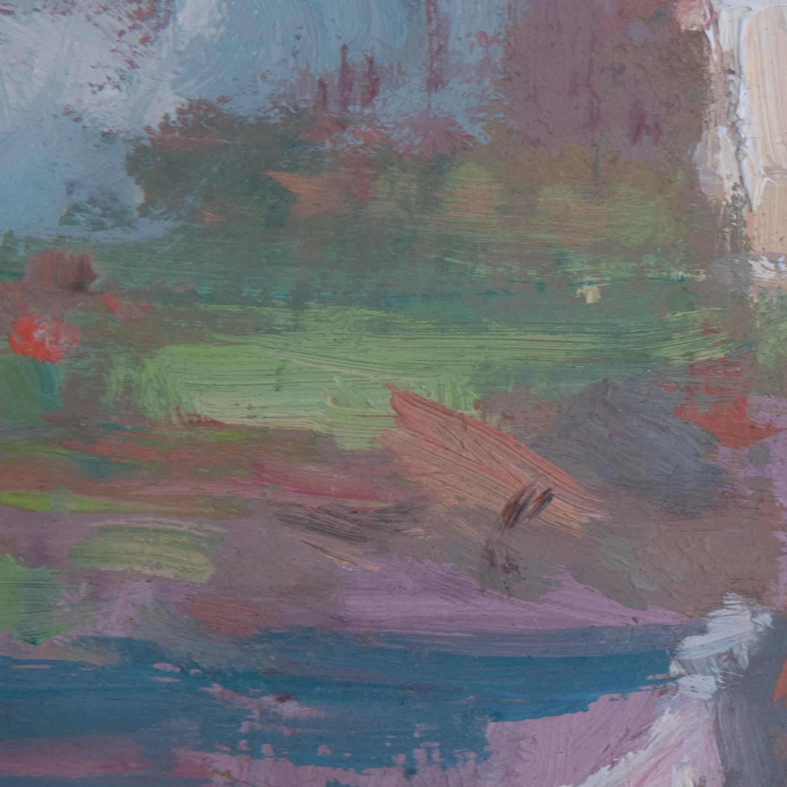 This evocative Impressionist oil painting portrays a vibrant gypsy encampment set in the open countryside. The artist captures the nomadic spirit through a group of figures gathered around a campfire beside a horse-drawn wagon, rendered in confident, gestural brushstrokes. Layers of rose, ochre, violet, and turquoise create a glowing palette that suggests the shifting light of dusk or dawn. The loose, expressive handling of paint emphasizes atmosphere and emotion over precision, giving the composition a lively immediacy. A balance of cool and warm tones generates depth, while the delicate haze of smoke and trees in the distance softens the rural setting. The work’s painterly energy and color harmony align it with mid-20th-century Catalan and European Post-Impressionist traditions that celebrated everyday life with poetic realism and fluid color.