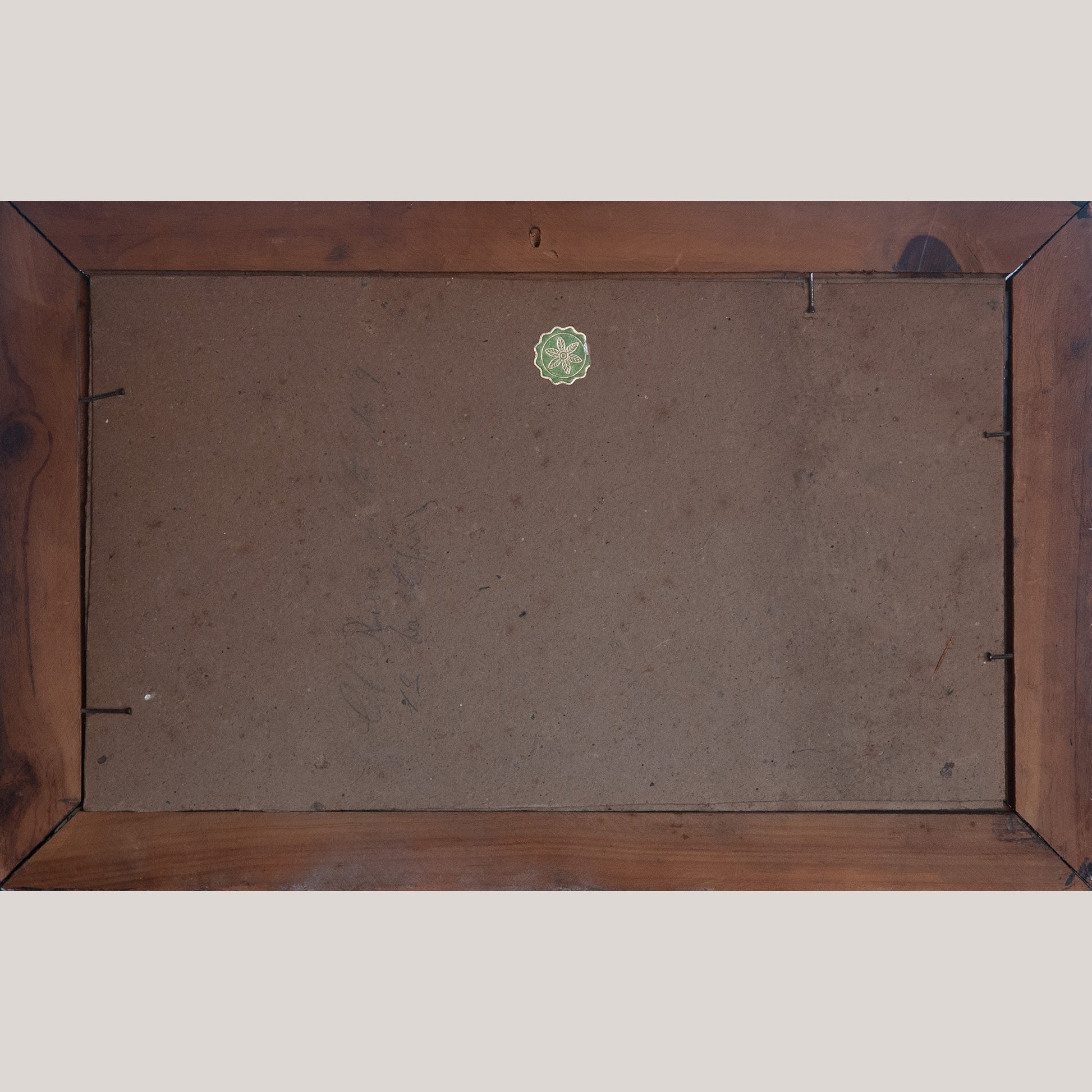 Presented in a black-stained wooden frame with minor age wear that enhances its vintage character.