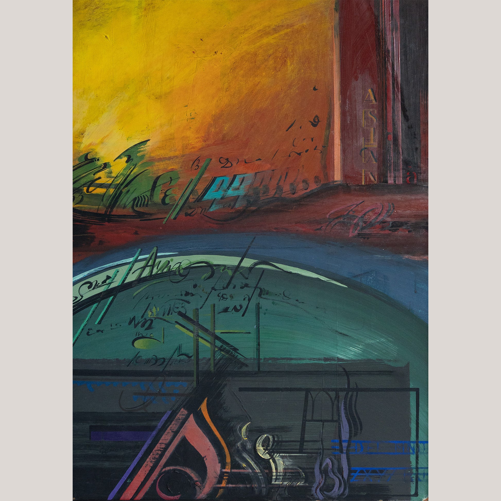 This dynamic mixed-media painting by Jaume Genovart presents a striking interplay of geometric precision and gestural abstraction. Layers of vivid color—burnt orange, crimson, turquoise, and deep violet—are structured into angular planes intersected by calligraphic forms and architectural lines. Genovart’s mastery of rhythm and spatial tension reflects his association with the Pintura-pintura and New Abstraction movements of late twentieth-century Catalonia, where emphasis was placed on the materiality and language of painting itself. The surface shows deliberate contrasts between textured pigment and linear draftsmanship, producing a dialogue between form and gesture that feels both controlled and improvisational. The composition’s gradient from dark, mechanical lower tones to radiant upper hues gives a sense of upward energy and intellectual balance, making it an arresting statement piece for refined contemporary settings.