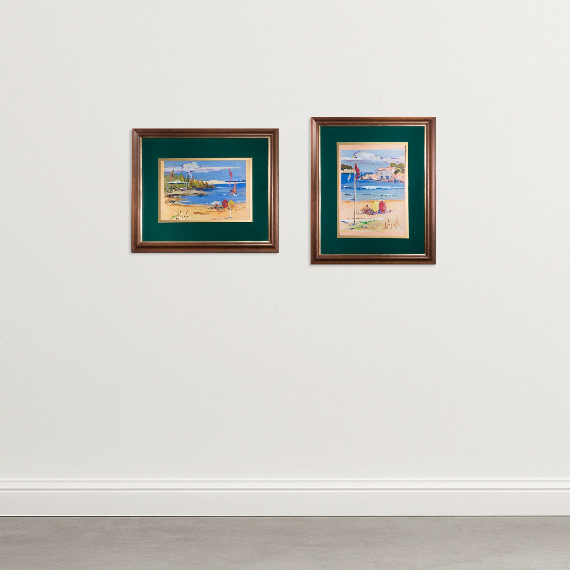 Both paintings are housed in matching wooden frames with green matting, showing light age wear consistent with use.