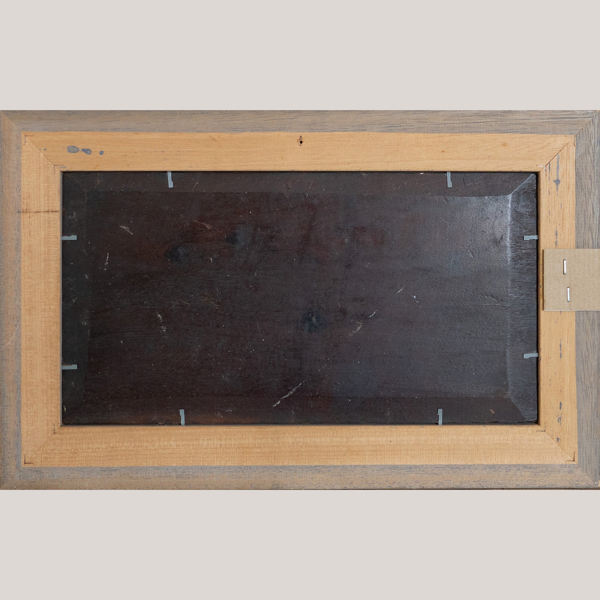 This 19th-century oil on panel captures a tranquil pastoral scene at dusk, where a shepherd tends his flock beneath a sky brushed with shifting clouds and soft light. The composition unfolds across a gently rolling meadow, leading the eye toward a weathered farmhouse and a solitary leaning tree silhouetted against the horizon. The artist’s delicate modulation of greys, ochres, and moss greens conveys both atmosphere and depth, while the textured handling of paint evokes the tactile qualities of earth and air. The sense of stillness and harmony reflects the rural realism of the late Romantic and Barbizon traditions, emphasizing the quiet dignity of the countryside. Subtle tonal contrasts and careful balance of light and shadow give the work a contemplative, enduring character suitable for refined interior settings.