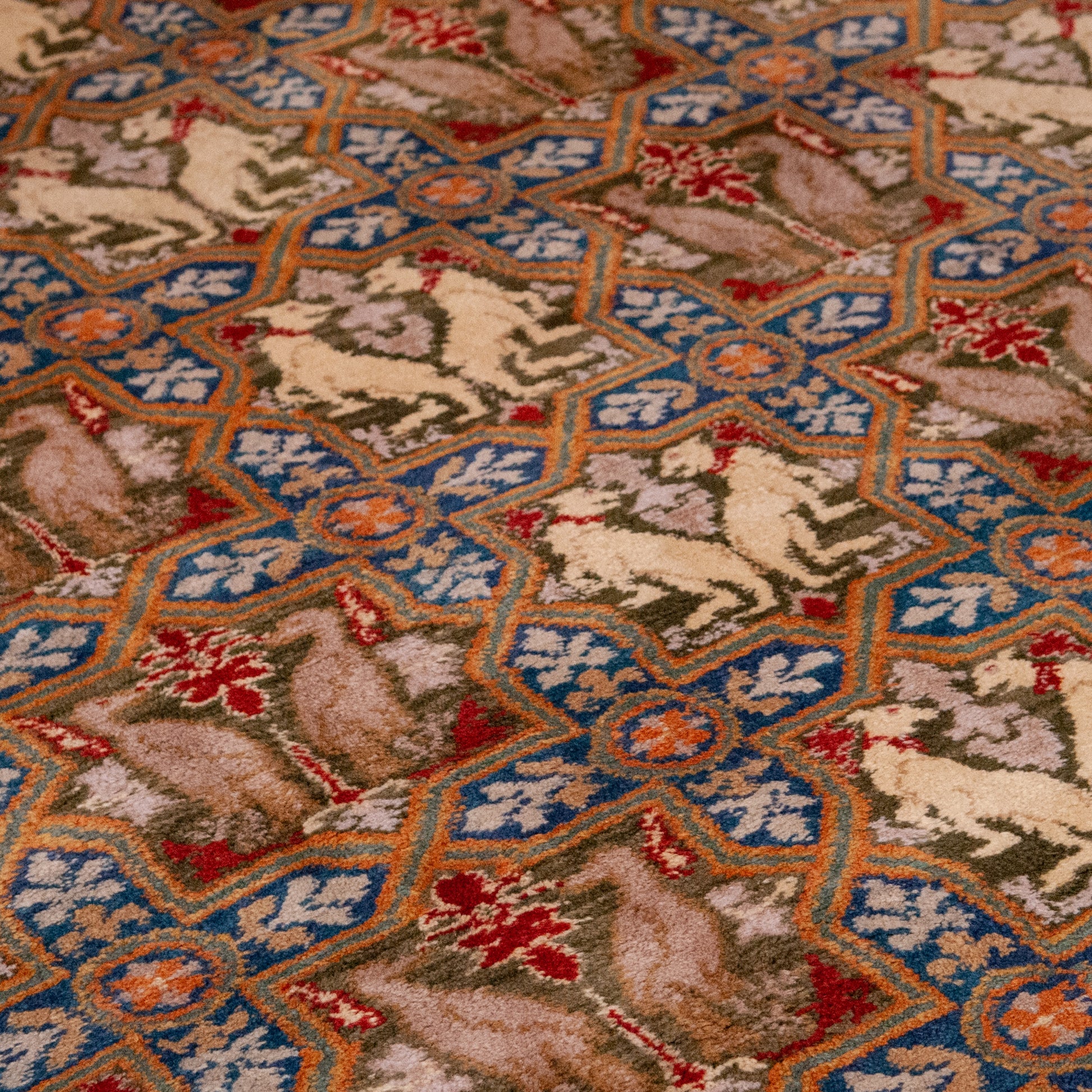 This very large hand-knotted Spanish wool rug presents a striking allover field of repeating heraldic animal motifs arranged within an interlocking geometric lattice, executed with exceptional clarity and balance. The palette combines soft mineral blues, warm terracotta reds, muted olive greens, and natural ivory tones, creating a surface that feels both richly decorative and harmoniously restrained. The dense pile and precise knotting give the motifs a sculptural presence, while subtle abrash variations lend depth and age to the composition. The design draws on historic Iberian textile traditions, where symbolic animals and geometric frameworks were used to convey strength, order, and continuity. A bold red border anchors the composition, framing the patterned field with rhythm and visual weight. The overall effect is architectural and timeless, suited to large spaces where scale and pattern can be fully appreciated, offering both visual impact and material substance.