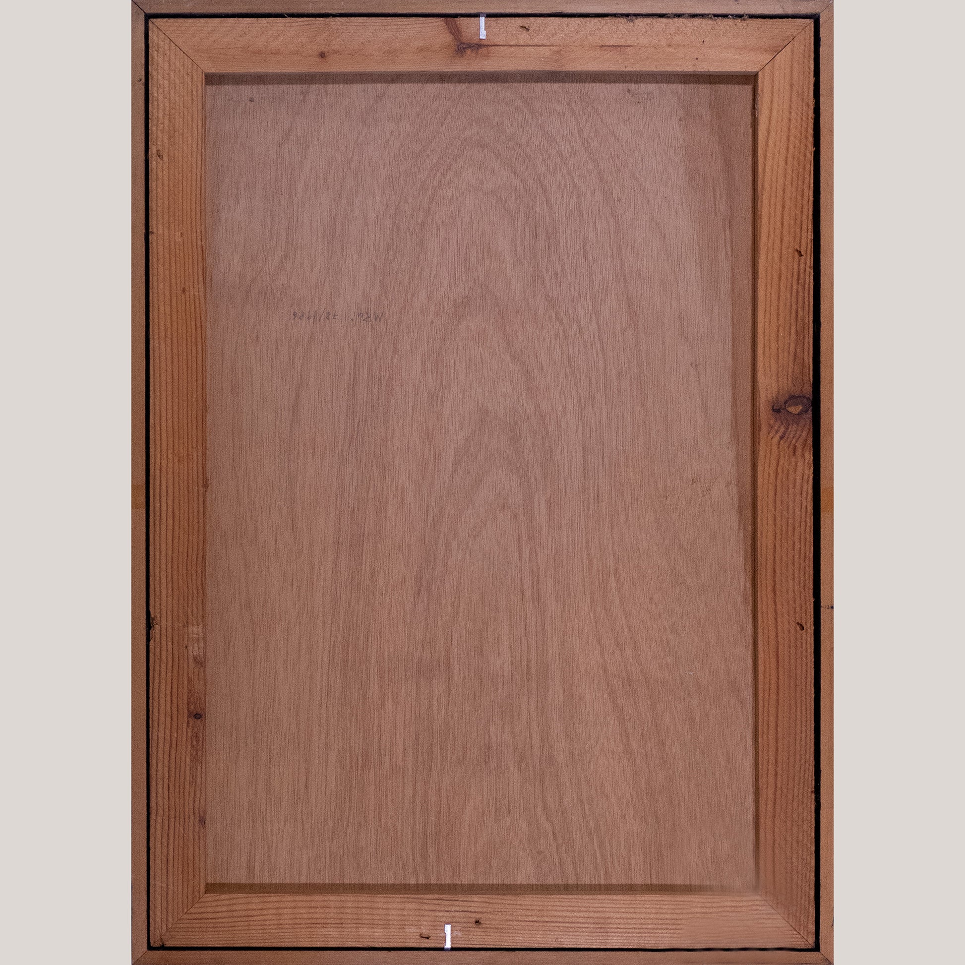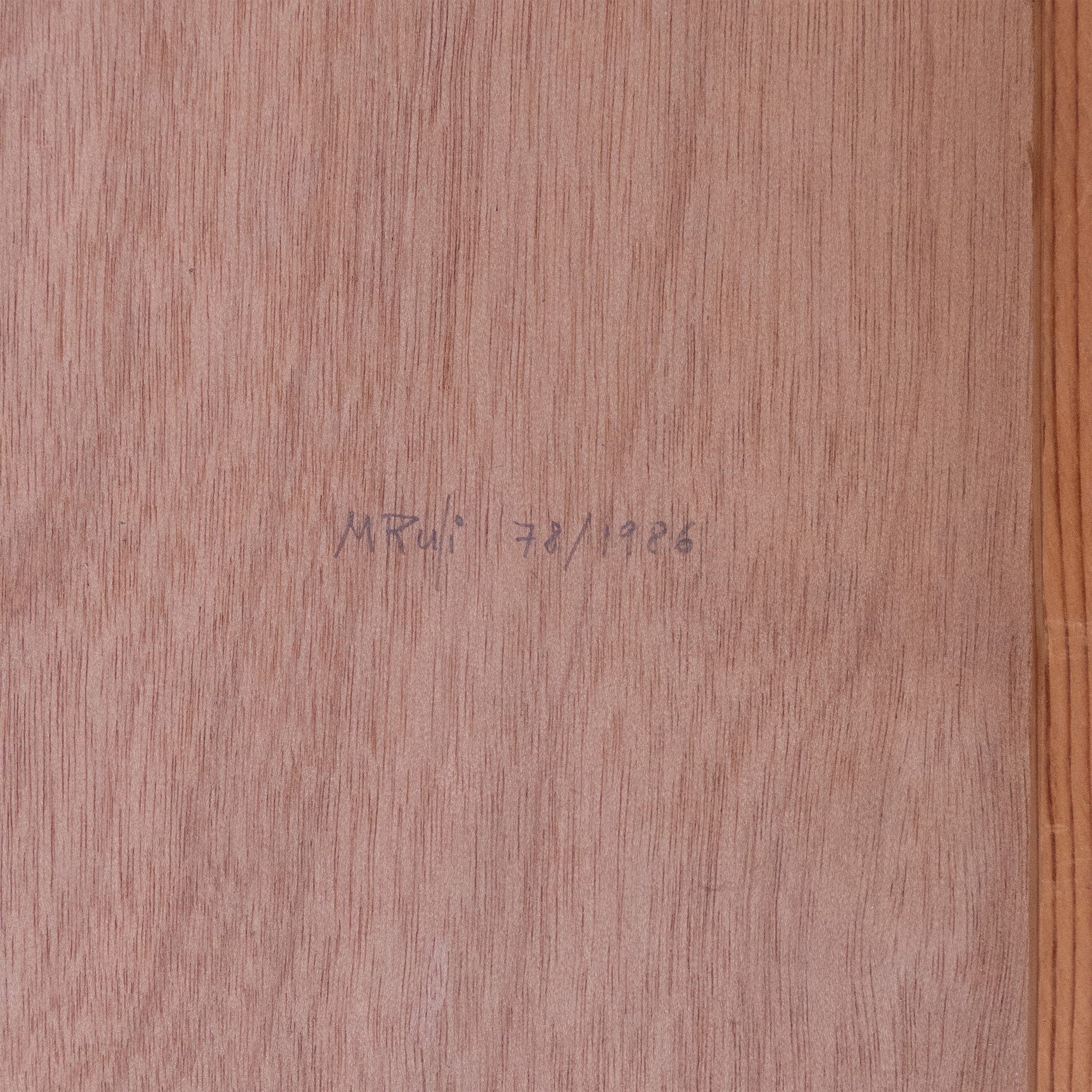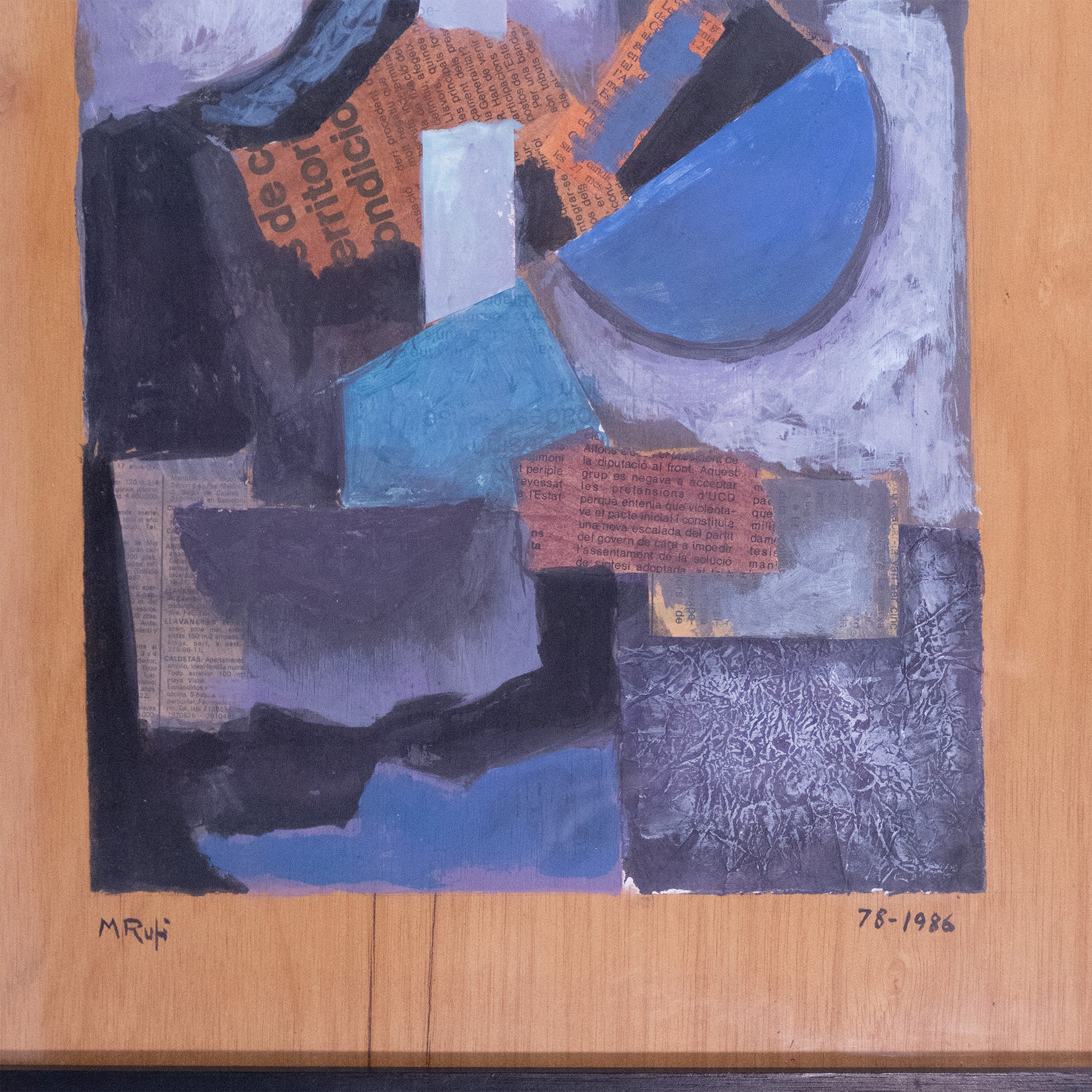 This 1986 mixed-media work by Manuel Rufi Gibert showcases his mastery of geometric abstraction and layered texture. Combining muted blues, purples, and greys with newspaper fragments, Rufi Gibert creates a dialogue between form and text. Bold orange accents enliven the subdued palette, while contrasts of matte and glossy surfaces add depth. Balancing structure and spontaneity, the piece blends mid-century modernist sensibilities with expressive materiality, its warm wood veneer grounding the composition in both tactility and refinement.
