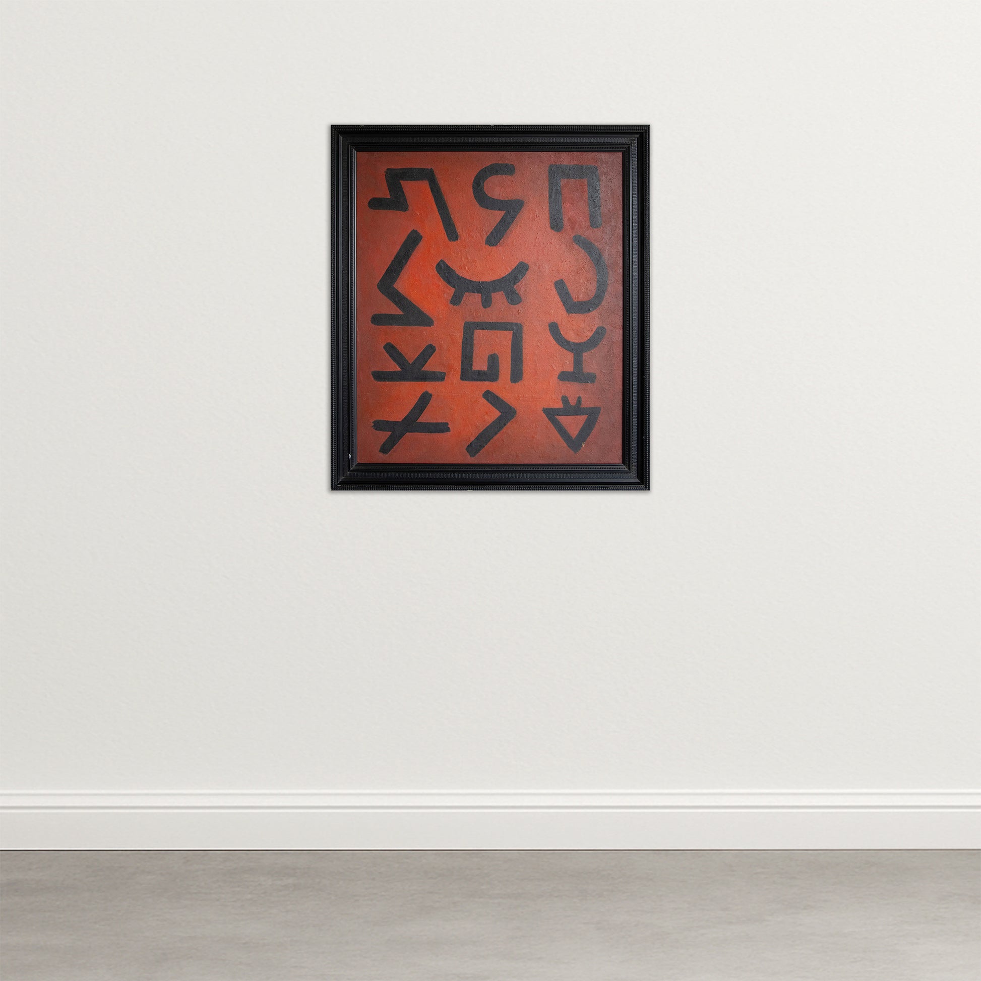 Painted by Manuel Rufi Gibert, this commanding abstract work exemplifies the artist’s signature exploration of geometry, rhythm, and surface texture. Against a deeply worked red background, a sequence of bold black symbols unfolds with measured precision, suggesting both coded language and architectural order. The composition’s austerity is offset by the warmth of the chromatic field, which reveals subtle tonal shifts and traces of the artist’s hand beneath the pigment. Rufi Gibert’s refined balance between form and spontaneity places this piece firmly within the lineage of post-war Catalan abstraction, where material presence and visual restraint define meaning. The interplay of flatness and depth, of symbol and silence, makes this painting an elegant statement of visual intelligence and tactile beauty suited to refined modern spaces.