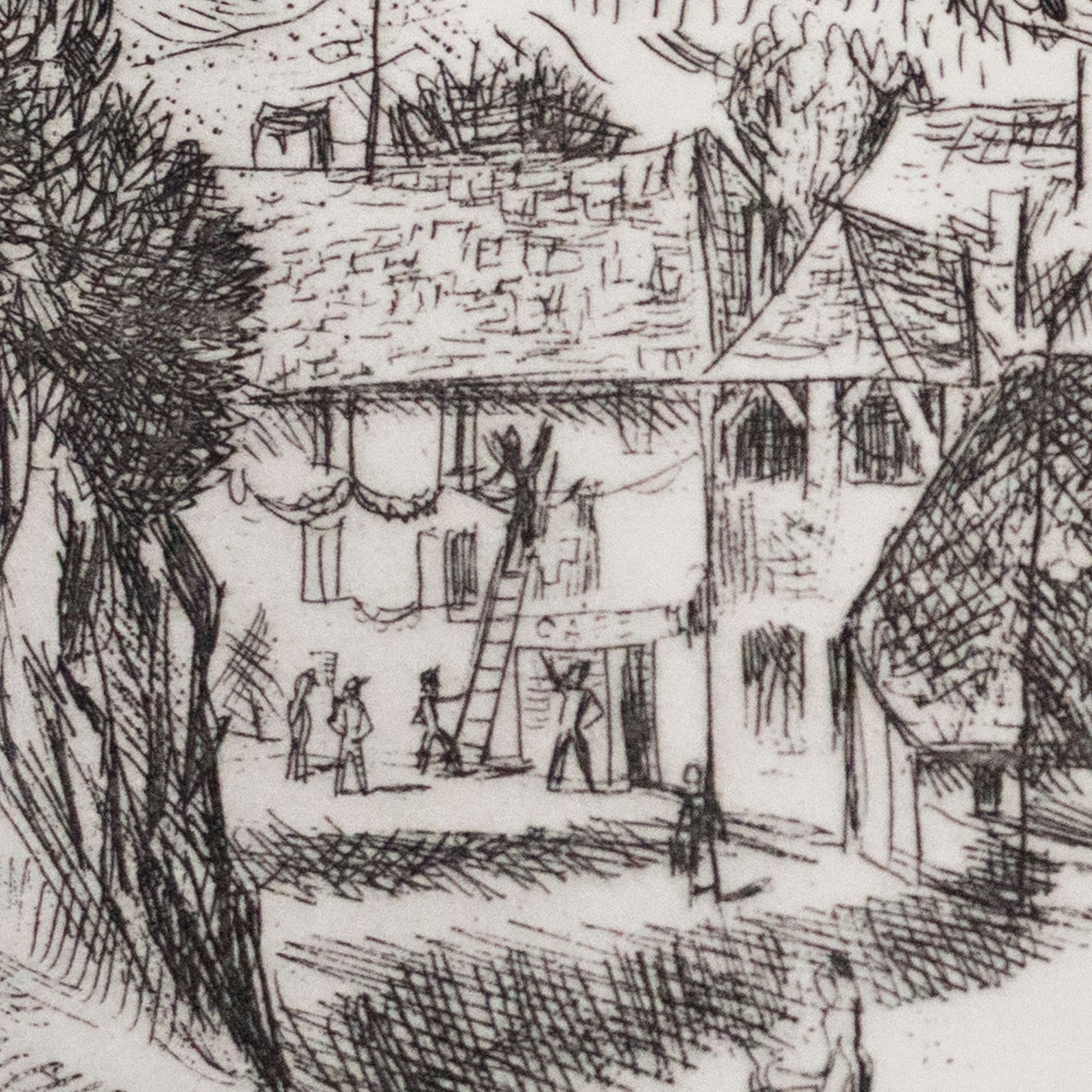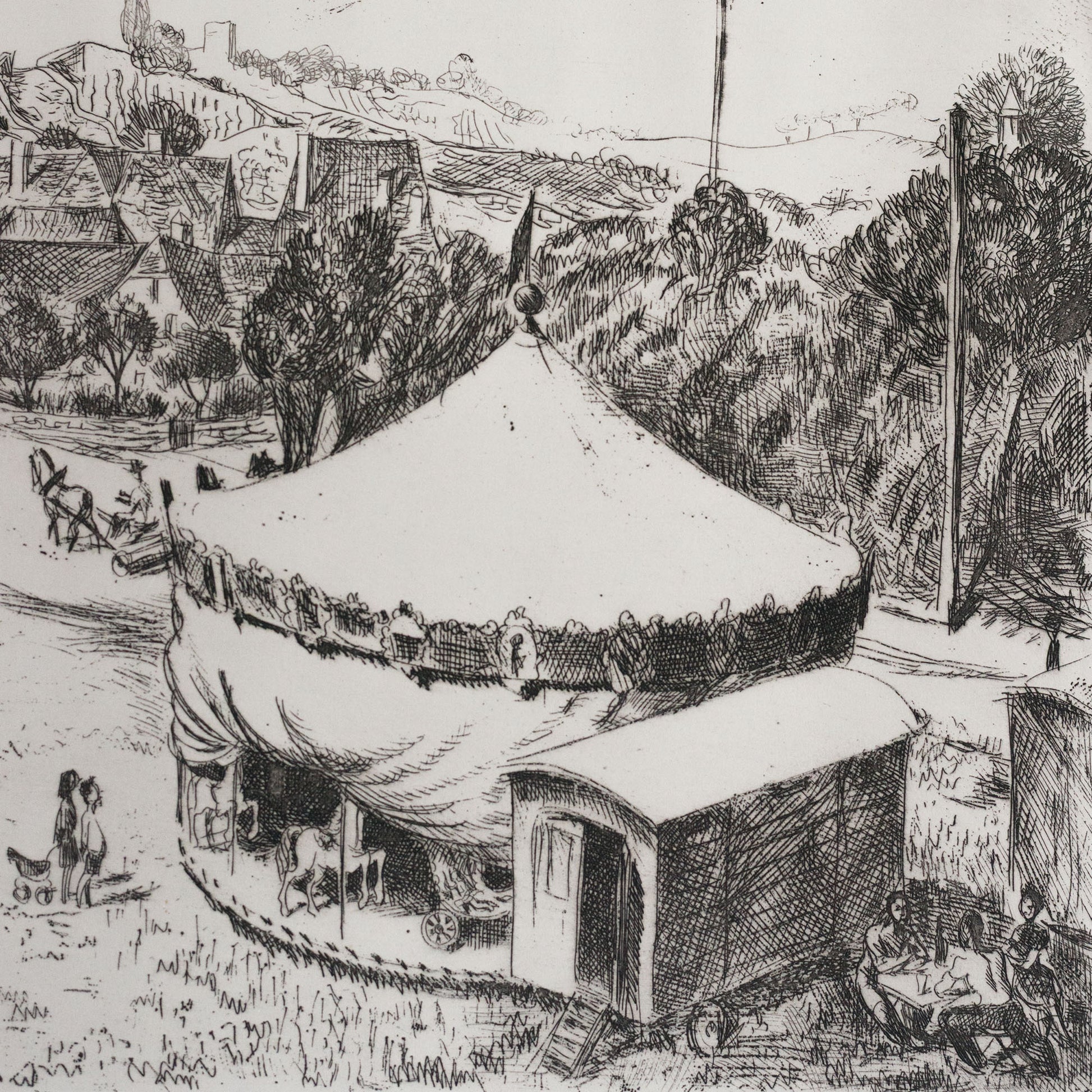 Marcel North presents a finely detailed etching depicting a carousel pavilion set within a rural village landscape, populated with small figures engaged in everyday activity. Executed with delicate linework and controlled cross-hatching, the composition leads the viewer from the foreground paths and figures toward clustered houses and rolling hills in the distance. The balanced arrangement and observational detail reflect North’s skill as a printmaker and illustrator within the tradition of twentieth-century European figurative etching.