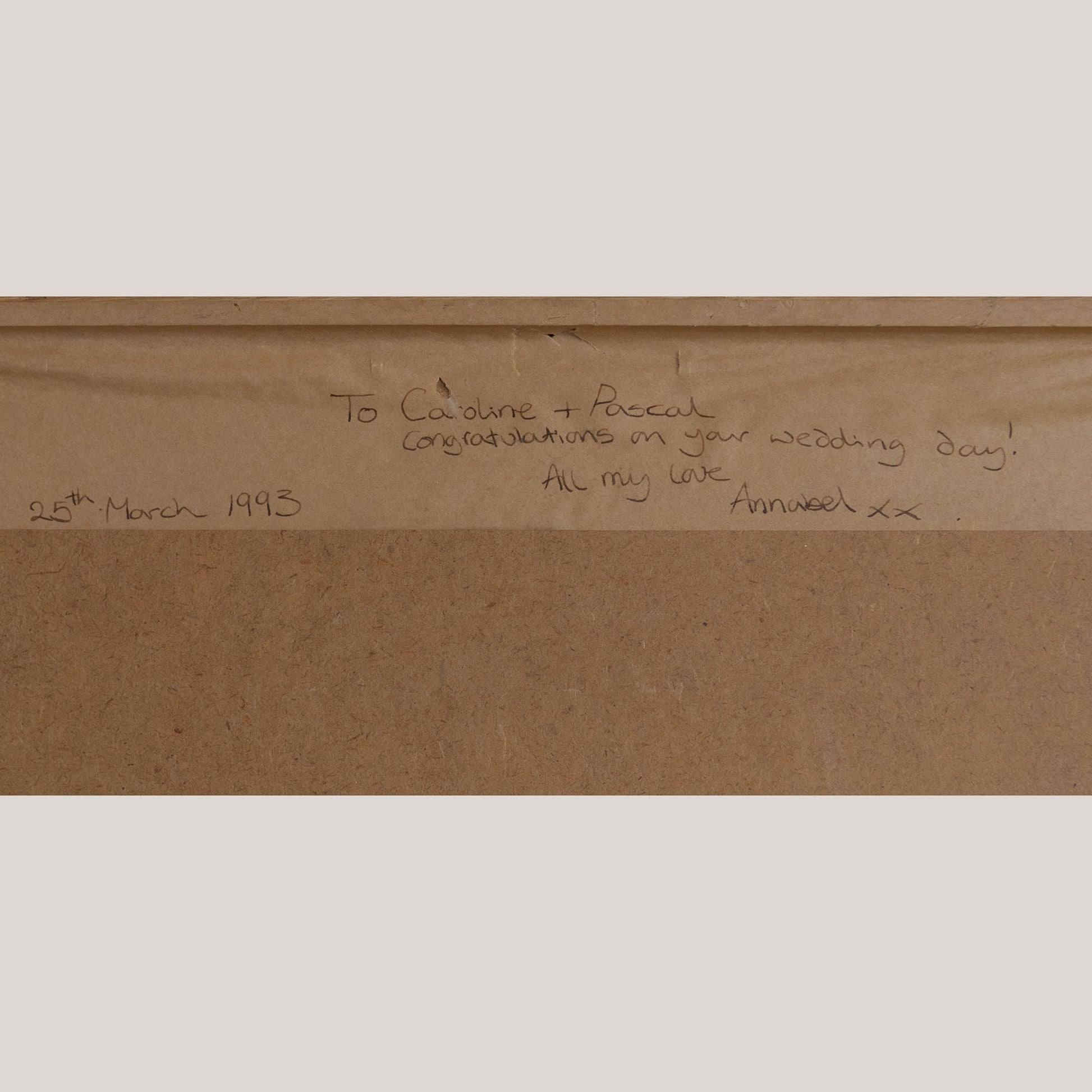 This framed charcoal drawing depicts a reclining nude figure rendered with confident, expressive line and tonal shading. Executed in charcoal on paper, the composition shows the model lying on a bed, her form defined through fluid contour work and areas of deep shadow contrasted against open passages of paper. The reverse bears a handwritten dedication dated 25th March 1993, indicating the work was gifted that year, while the style and academic handling suggest the drawing itself may date from circa 1950 to 1970. The loosely articulated background and assured anatomical modelling reflect traditional studio life drawing practice, giving the piece a strong mid-century figurative character and refined monochrome presence.