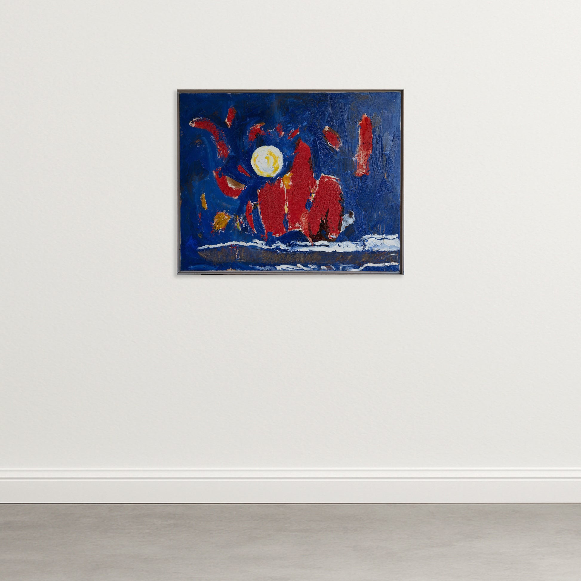 The composition reflects characteristics of mid-20th-century European abstraction, with emphasis on gesture, colour contrast, and expressive surface texture. The confident use of impasto and symbolic form suggests familiarity with post-war painterly movements.