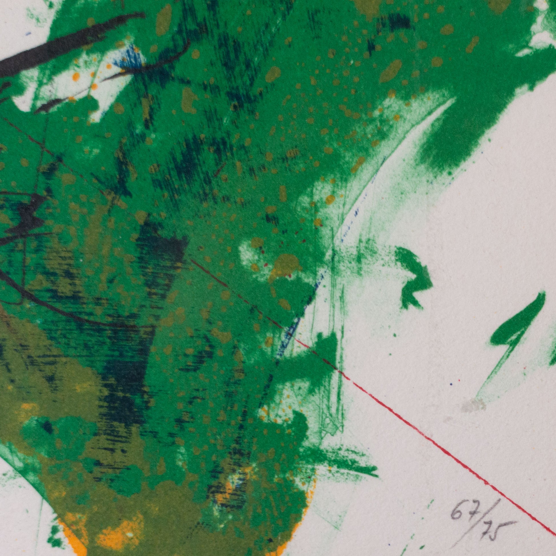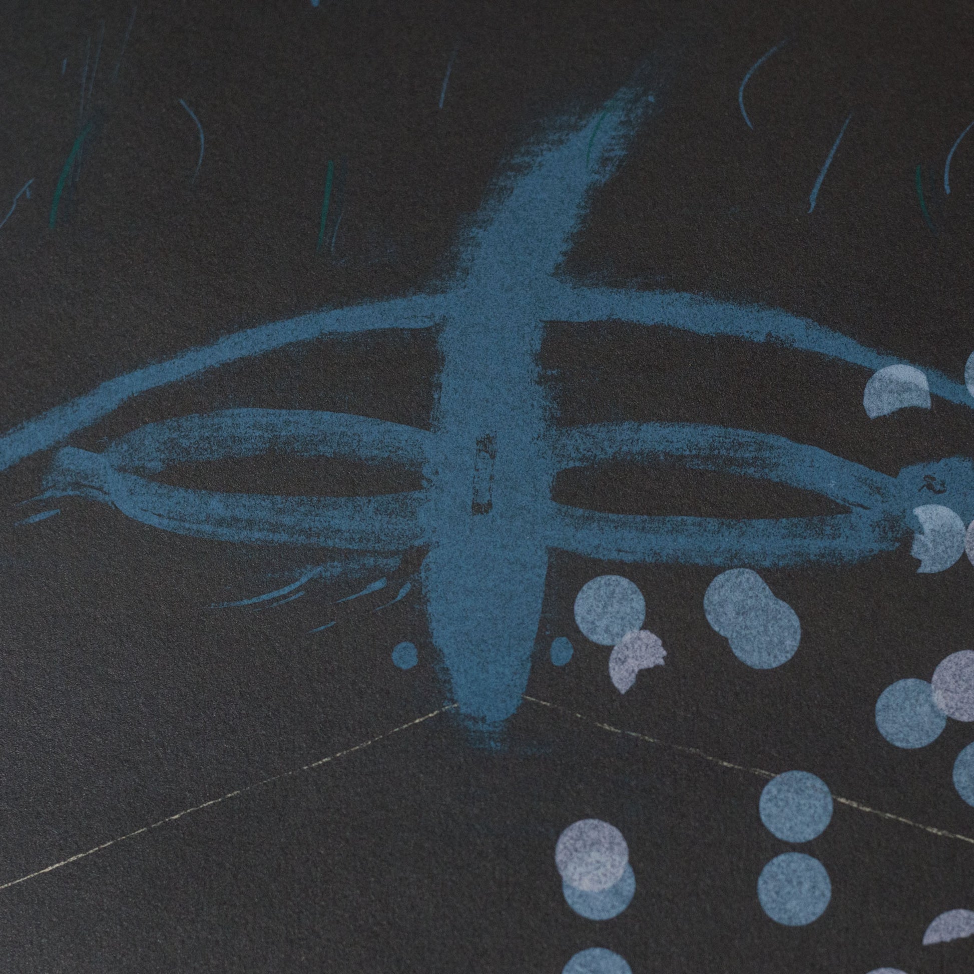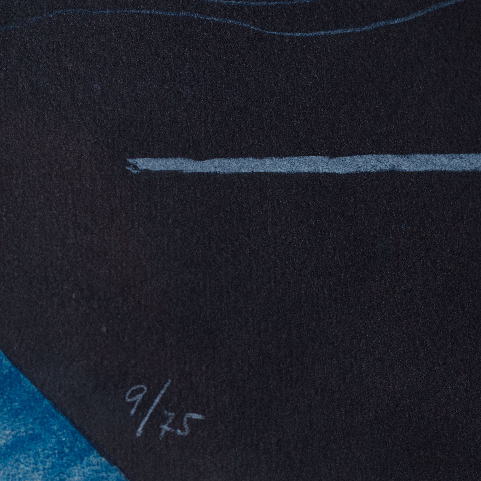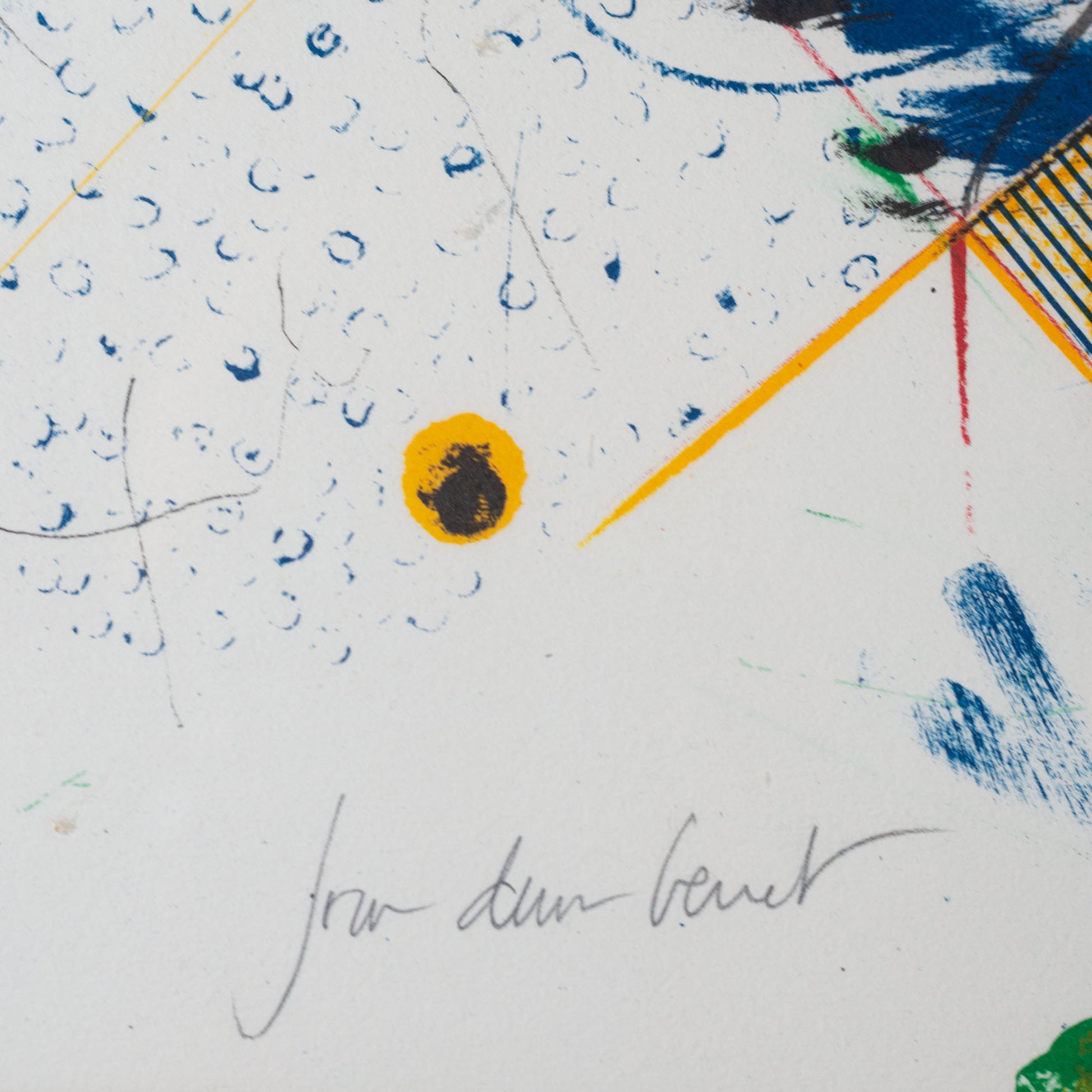 This pair of vintage abstract lithographs consists of two signed limited edition prints executed through layered lithographic processes. Both works combine flat colour fields with linear drafting, overprinting, and controlled gestural marks. One composition is organized around a dominant red plane intersected by circular forms, angular elements, and textured passages in blue, green, black, and yellow. The second lithograph employs a darker tonal ground, structured through fine linear diagrams, curved arcs, and simplified geometric symbols rendered in muted blues and greys. Variations in line weight, transparency, and surface texture indicate multiple printing stages and deliberate registration. The consistent scale, framing, and visual language support their presentation as a coordinated pair.