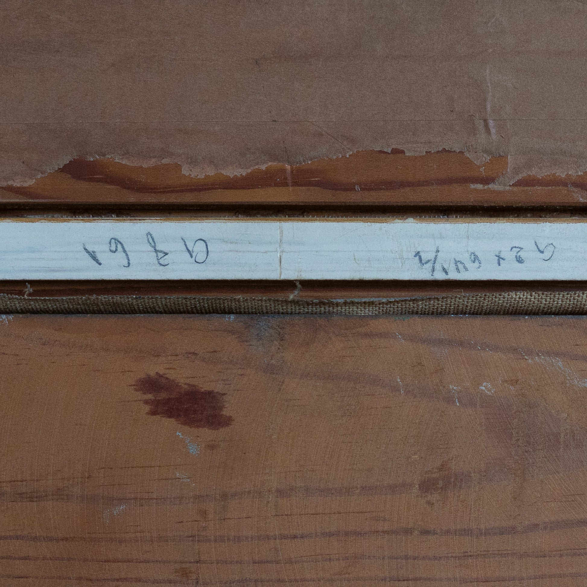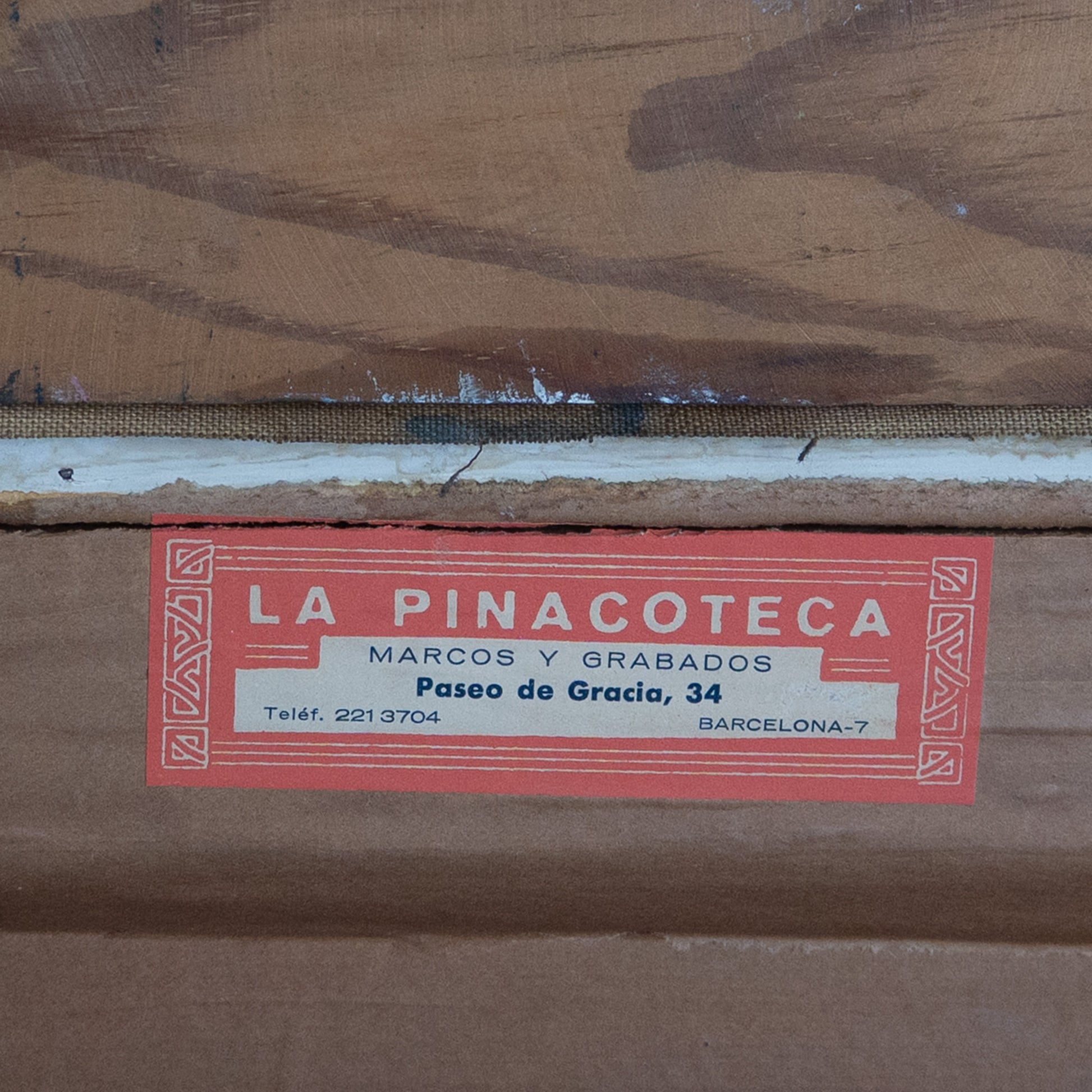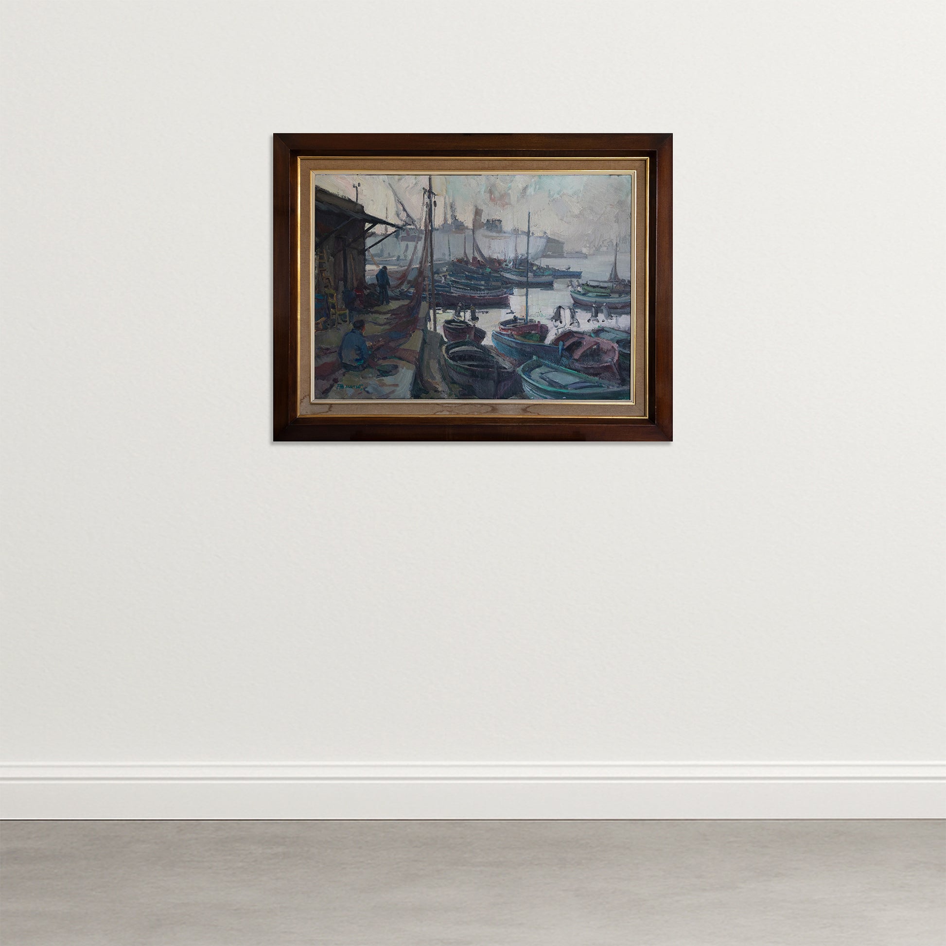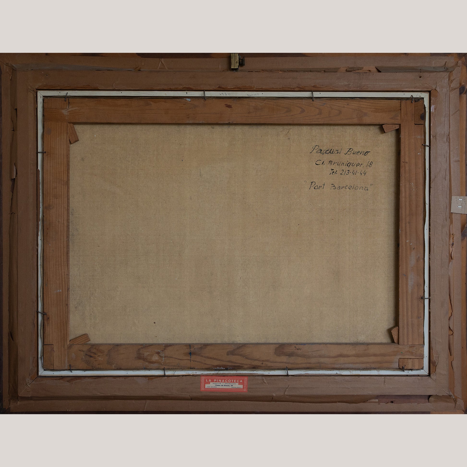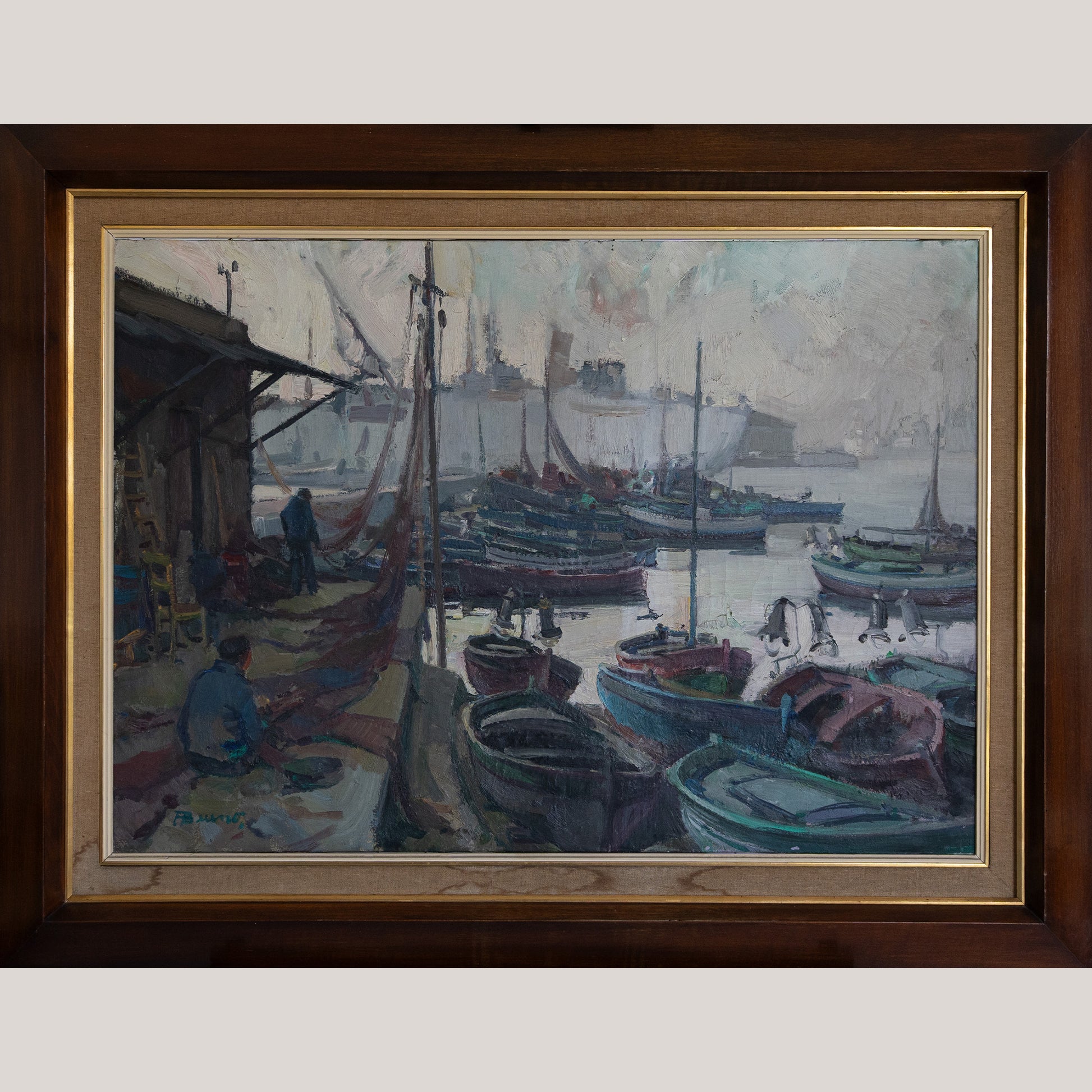 This evocative oil on canvas by Pascual Bueno Ferrer (b.1930, Barcelona) captures the Port of Barcelona enveloped in a gentle maritime haze. The composition unfolds with rows of small fishing boats moored at the quay, their reflections softly rippling across silvery water. Figures along the dock prepare and mend nets, bringing a human rhythm to the tranquil industrial setting. Bueno’s palette—composed of cool grays, slate blues, and muted ochres—creates a misty harmony that suggests early morning light diffused through sea air. His impasto brushwork and layered textures convey both atmosphere and structure, merging precision with painterly spontaneity. The work exemplifies the lyrical realism of Catalan Post-Impressionism, blending observation with mood. On the reverse, the canvas bears an inscription in the artist’s hand: “Pascual Bueno, C/Aribau 18, Tel. 23-44-44, Port Barcelona,” confirming its authorship and location.