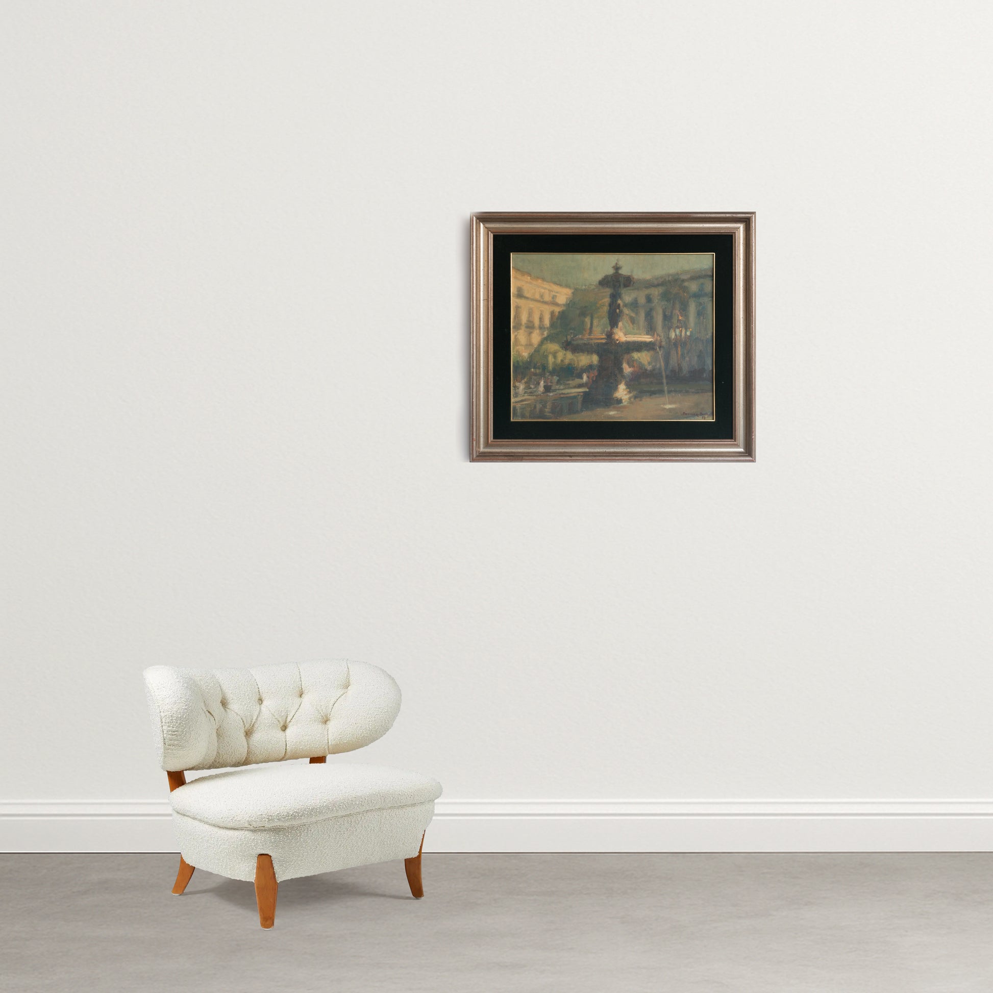This impressionist oil on canvas depicts Plaça Reial in Barcelona, focused on the central fountain and the surrounding arcaded façades. The scene is constructed with loose, confident brushwork that emphasizes light, tonal balance, and overall atmosphere rather than architectural precision. A restrained palette of muted greens, warm ochres, grey-blues, and soft earth tones creates depth and visual cohesion across the composition. Light is evenly diffused, with subtle reflections in the fountain anchoring the foreground. Figures are lightly indicated to provide scale and a sense of everyday urban activity without narrative emphasis. The painterly surface and softened forms align the work with mid-20th-century European impressionist-influenced cityscapes, where mood, place, and visual rhythm take precedence over detailed description.