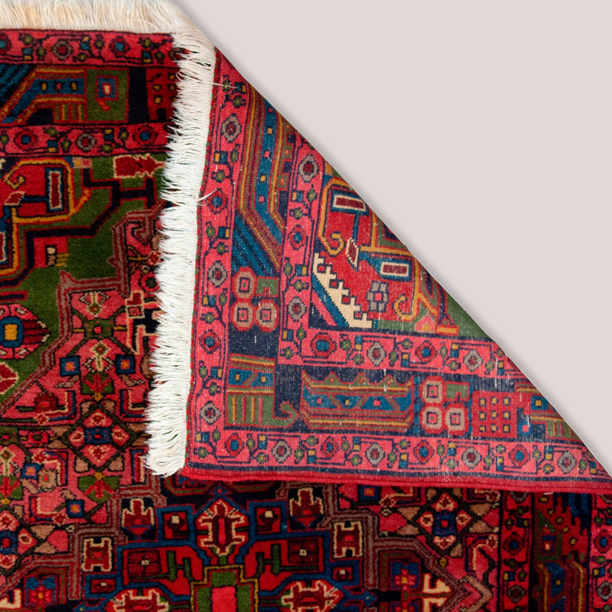 This vintage hand-knotted Persian Heriz rug embodies the timeless artistry of Northwest Iran’s weaving heritage. Featuring a commanding central medallion, the rug’s geometric composition is accentuated by a bold palette of deep crimson, emerald green, indigo, and ivory. The dense wool pile reflects the natural sheen of hand-spun fibres, revealing subtle tonal variations that enhance the piece’s authenticity and age. Intricate angular motifs and stylized floral forms radiate across the field and borders, demonstrating the classic balance and strength of Heriz craftsmanship. With its striking design, durable construction, and enduring colour harmony, this vintage Persian rug serves as a distinguished statement piece for both contemporary and traditional interiors.