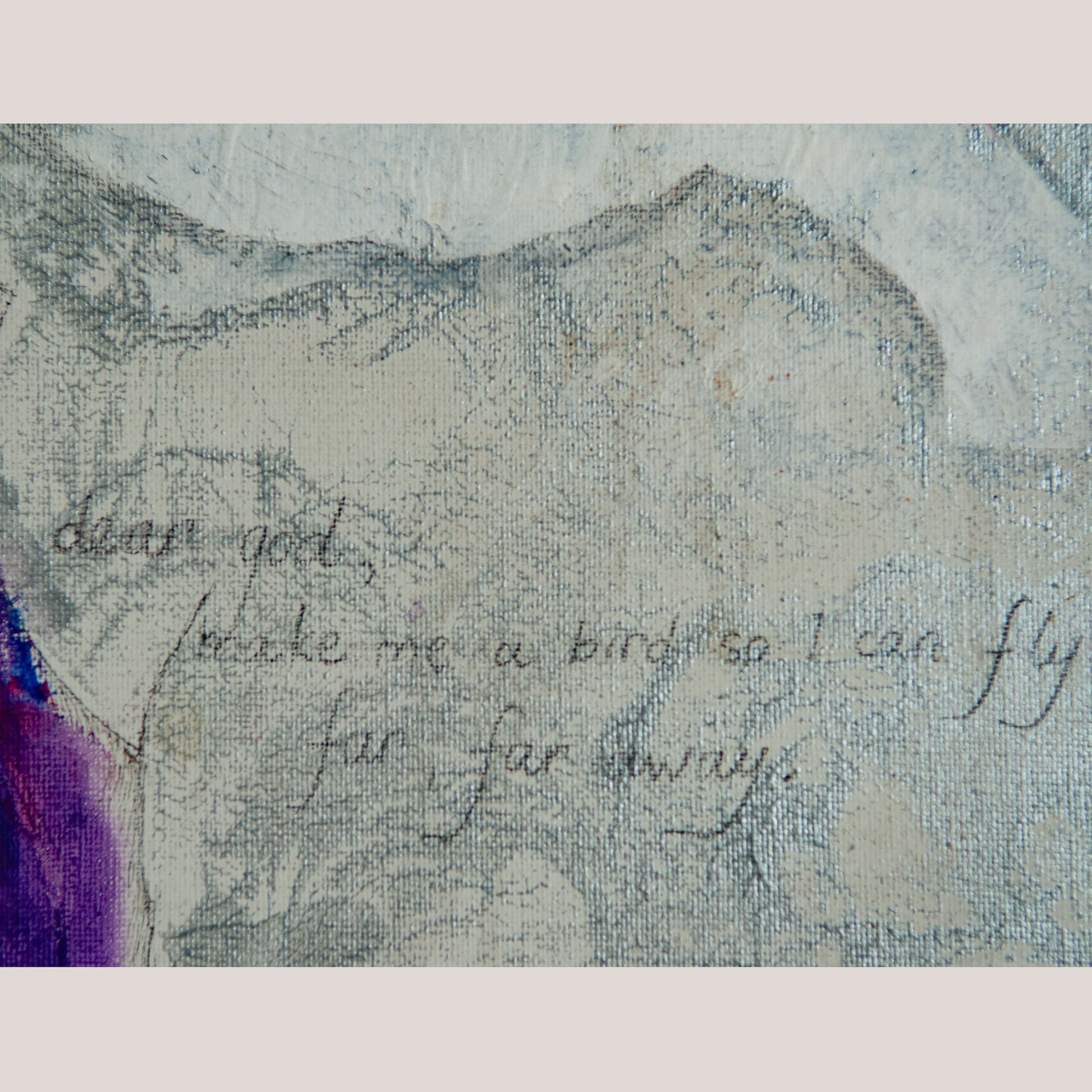 This striking abstract mixed-media painting signed C. Bravo combines bold geometric structure with lyrical emotion. Vertical black and white bars create a sense of rhythm and confinement, while vivid accents of violet, crimson, and blue energize the composition. Above, a faintly drawn bird soars within a pale sky, accompanied by the handwritten phrase, “dear god, make me a bird so I can fly far far away.” The integration of text, texture, and layered pigment evokes longing and transcendence. The artist’s technique reveals a balance between disciplined design and expressive freedom, resulting in a deeply atmospheric composition that bridges abstraction and narrative. Its tactile surface and visual poetry make it a compelling focal point in any refined contemporary setting.