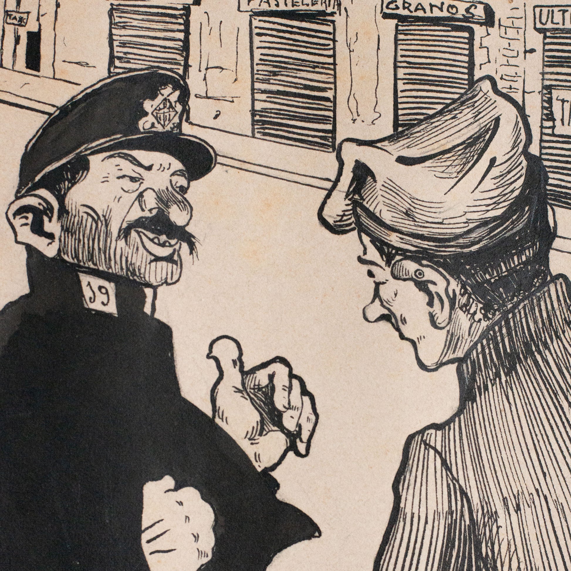 This original pen and ink set presents three satirical cartoon scenes by currently unidentified artists working within the Spanish or Catalan caricature tradition. Top: A uniformed official stands before a building marked “Gobernació” (Government), rendered with exaggerated proportions and formal stance, emphasizing bureaucratic authority. Bottom left: Two men in period dress engage in an animated street exchange, their expressive gestures and confident linework conveying social tension within an urban architectural setting. Bottom right: A policeman confronts a civilian along a row of shuttered shops bearing inscriptions including “Tancat” (Closed), “Sastreria” (Tailor), “Ultramarinos” (Grocer), and “Panadería” (Bakery), suggesting a commercial street scene marked by closure or disruption. The works are defined by bold ink contrasts and precise draughtsmanship characteristic of early 20th-century satirical illustration.