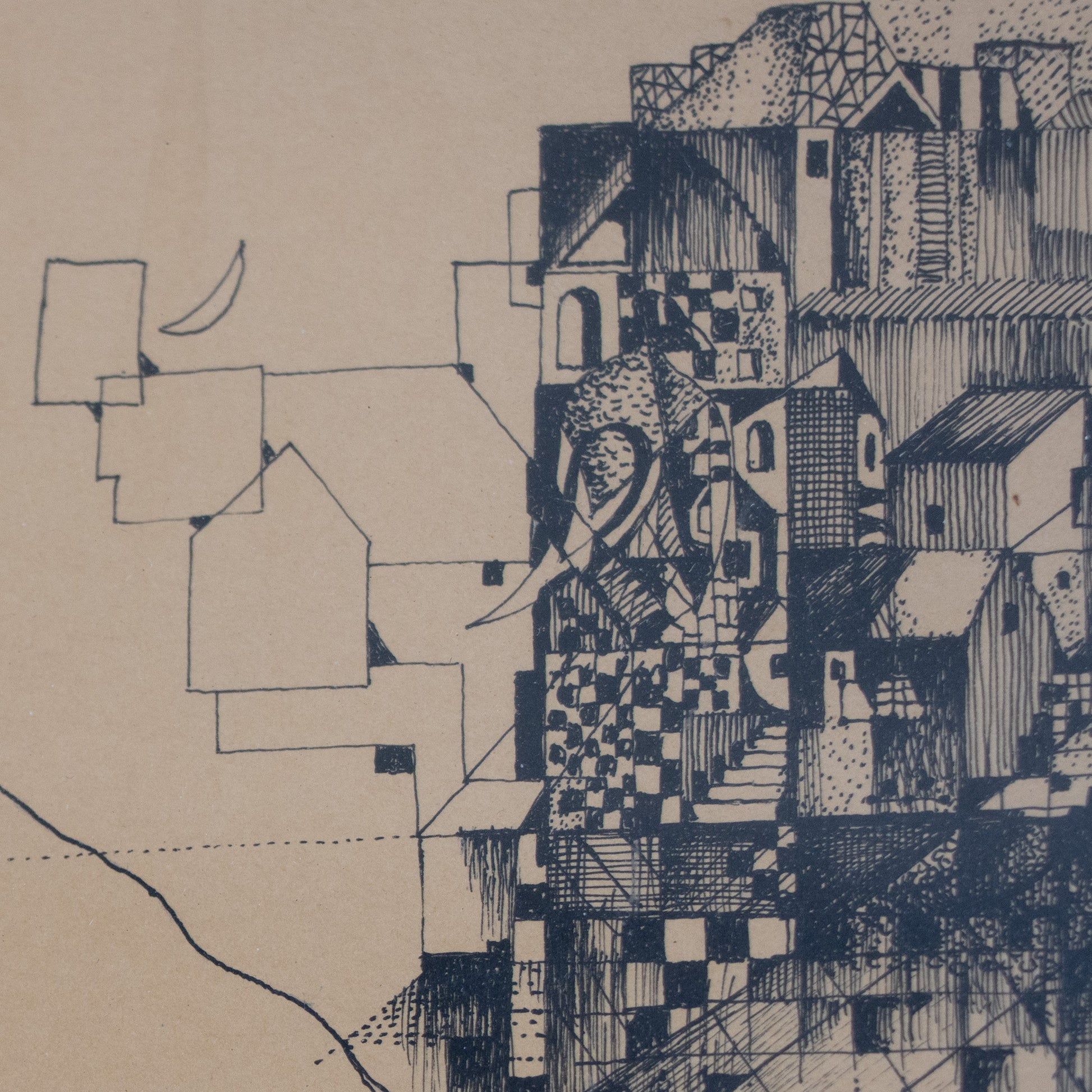This original pen and ink drawing from 1961 presents a captivating surreal architectural landscape that merges geometric precision with imaginative abstraction. The artist constructs a complex cityscape of interwoven buildings, stairways, and textured grids, balanced against the minimal outline of a human form. The interplay between densely rendered detail and vast open space creates a dynamic visual rhythm, suggesting both structure and dreamlike suspension. Executed in fine black ink on aged paper, the composition demonstrates exceptional control of line, cross-hatching, and perspective, recalling the analytical approach of architectural draftsmen while evoking the poetic ambiguity of surrealism. The monochrome palette and meticulous technique give the piece an enduring modernity, inviting contemplation of order, balance, and the hidden architecture of thought.