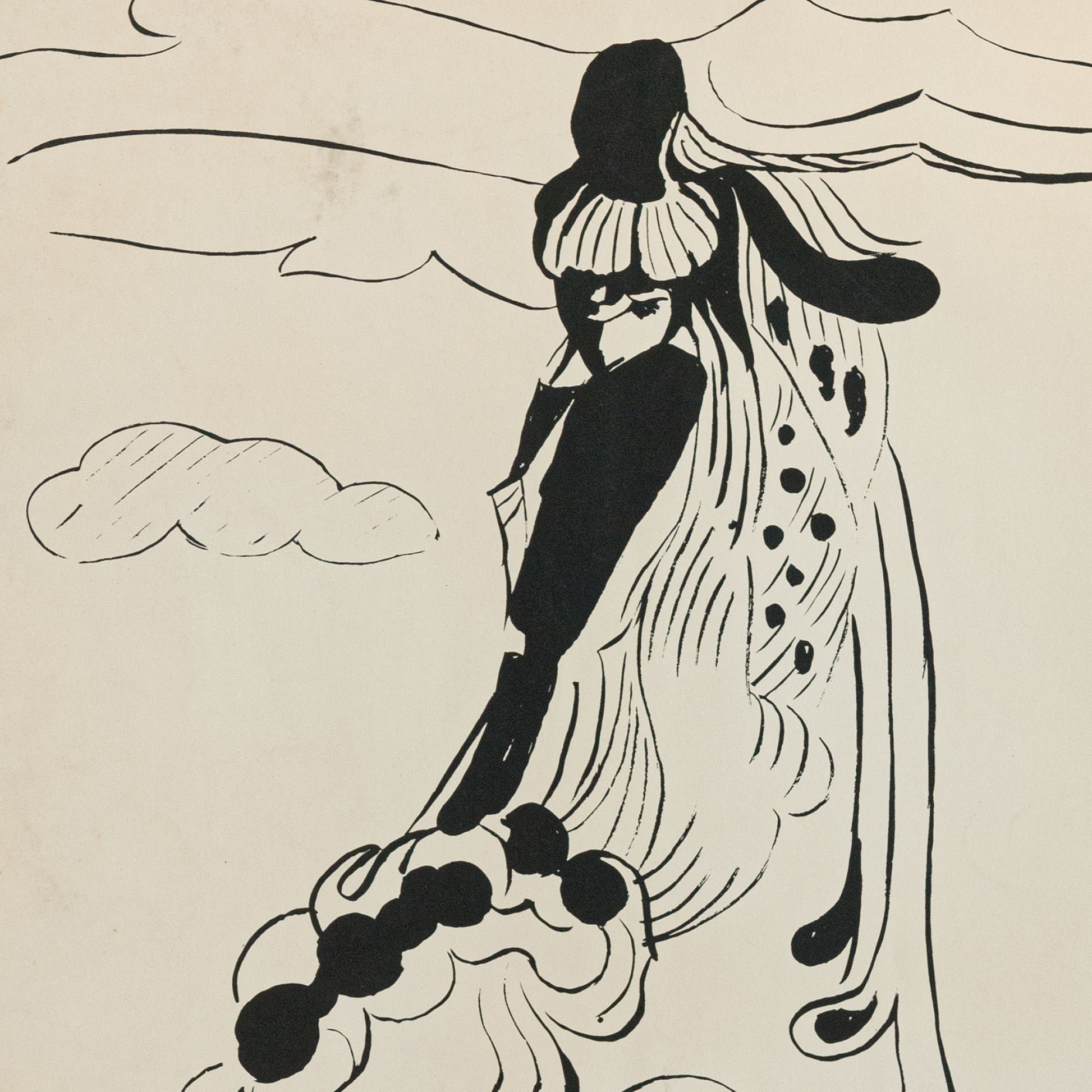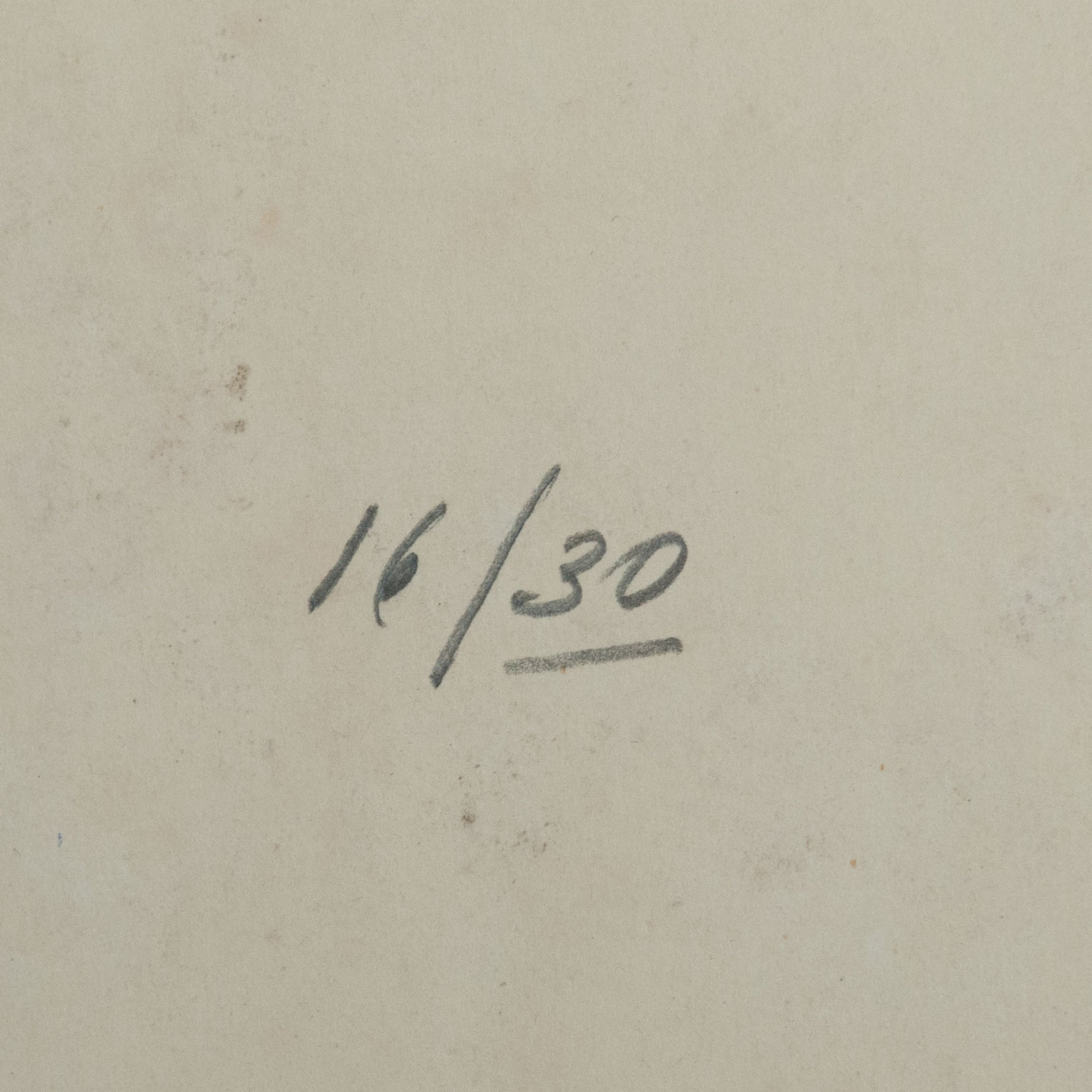 Teresa Vilarrubias created this signed limited edition silkscreen print, characterised by precise linear detail and a stylised figurative composition. The work demonstrates controlled draughtsmanship, strong tonal contrast, and a balanced arrangement of decorative elements within a clearly defined graphic structure. The flattened perspective and emphasis on contour reflect early twentieth-century illustrative traditions, while the disciplined use of line and pattern gives the image clarity and cohesion. Issued in limited numbers and bearing the artist’s signature, the print represents a concise example of her decorative modernist approach.