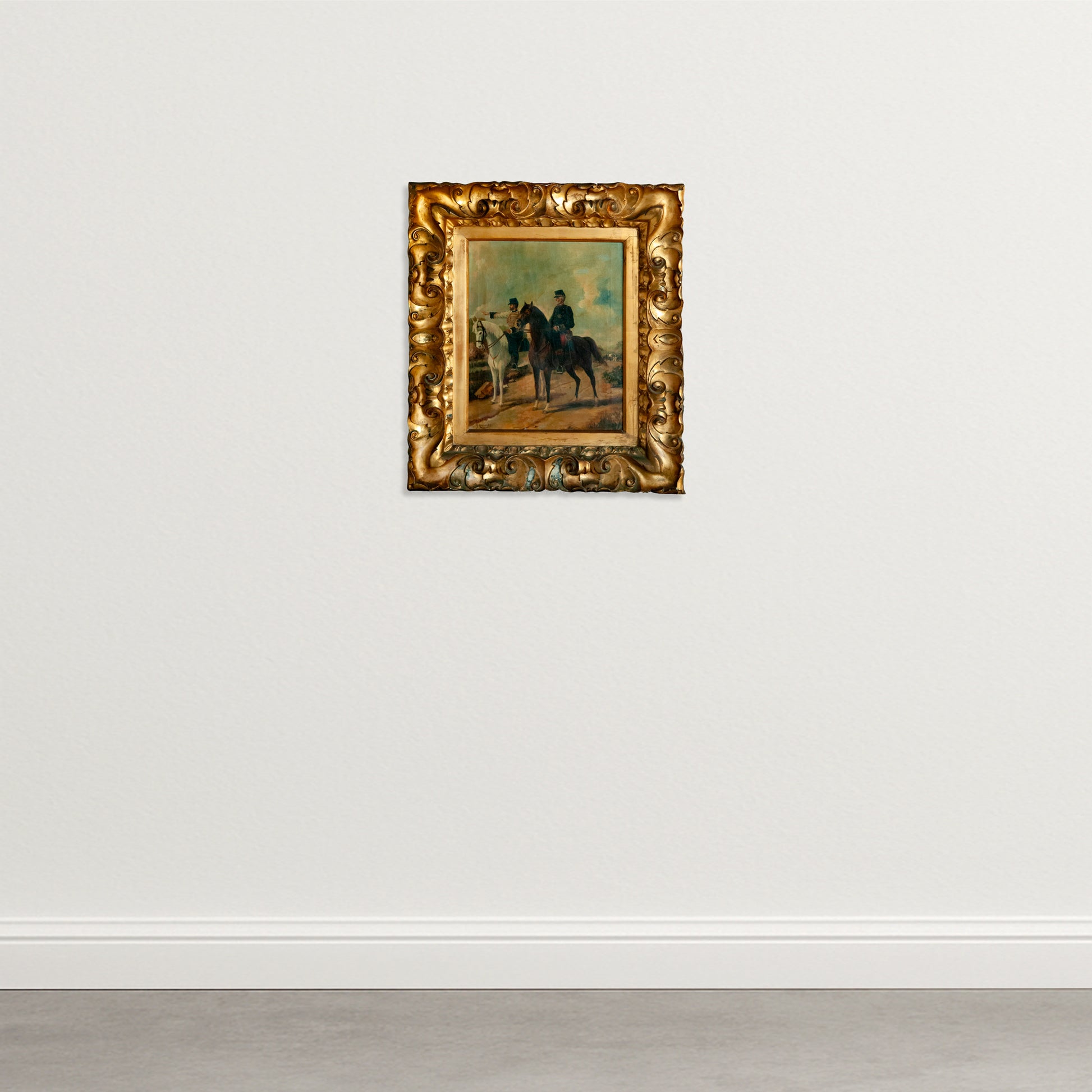 This finely detailed oil painting, signed J. Cusachs, portrays two mounted officers in full regimental attire, composed with precision and quiet authority. The scene captures a moment of military command, one figure gesturing forward while the other observes calmly astride his horse. The artist demonstrates a skilled hand in the rendering of anatomy, uniform texture, and the natural stance of the horses. The palette of soft earth tones, muted greens, and sky blues conveys both discipline and atmosphere, characteristic of late 19th-century academic realism. Subtle lighting and balanced composition lend depth and gravity to the scene, blending technical finesse with narrative restraint. The work embodies the era’s fascination with military life and equestrian subjects, making it an impressive and historically evocative piece for traditional interiors.