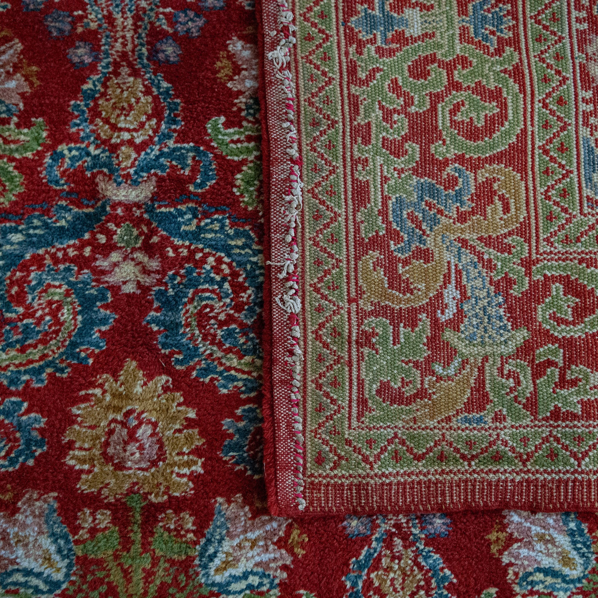This vintage Spanish hand-knotted rug presents a richly ornamented floral medallion composition executed in wool, characterized by a saturated red ground enlivened with soft blues, olive greens, and warm ochres. The surface is densely patterned with repeating stylized floral and foliate motifs, arranged in a balanced, symmetrical rhythm that gives the rug both decorative presence and visual depth. A finely articulated border frames the central field, reinforcing the structure while adding contrast through tighter geometric detailing. The pile shows nuanced variation in tone, consistent with traditional hand-dyeing and age, lending the piece warmth and authenticity. The overall effect is decorative yet grounded, with a classical sensibility typical of Spanish regional weaving traditions influenced by historic Mediterranean and Moorish design language. Its scale, color richness, and intricate workmanship make it suitable as a focal textile within refined residential or curated design settings.