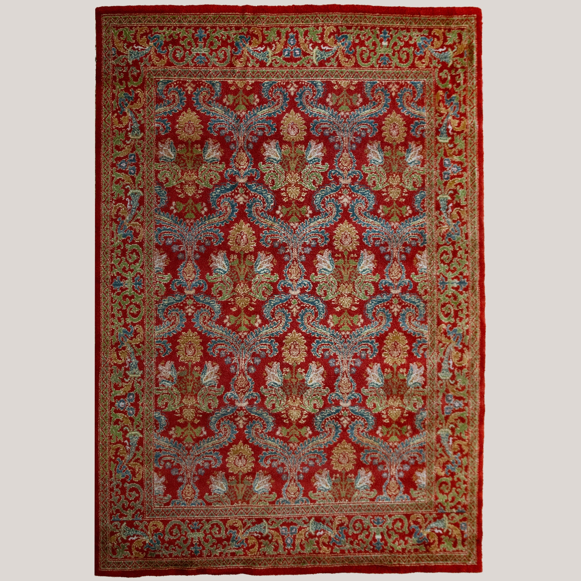 The rug was produced by an unidentified Spanish workshop, likely operating within a regional tradition known for adapting classical European and Moorish-inspired motifs into hand-knotted wool carpets. The design reflects skilled artisanal weaving rather than industrial production, with attention to symmetry, border articulation, and color harmony.