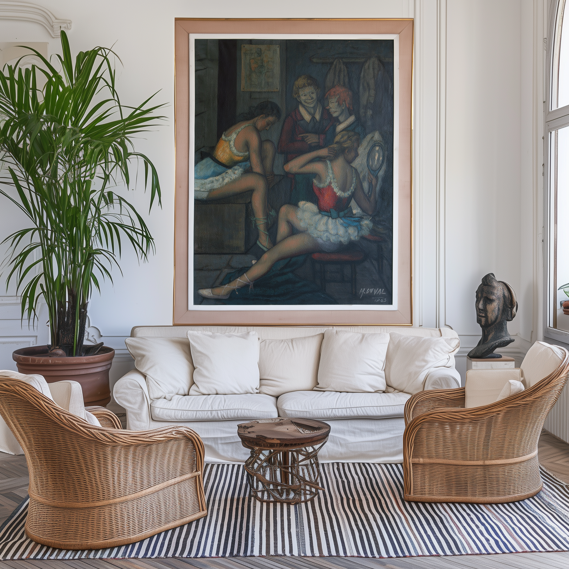 This evocative 1963 oil on canvas by the little-known artist M. Duval captures a rare and intimate glimpse into the backstage world of performance. The composition depicts two ballerinas adjusting their costumes while two clowns converse nearby, merging the worlds of grace and comedy within a dimly lit dressing room. Duval’s confident brushwork and layered textures evoke the tactile richness of tulle, velvet, and painted faces, while the subdued tones of umber, teal, and crimson create a sense of nostalgia and theatrical atmosphere. The contrast between the dancers’ poised elegance and the clowns’ expressive features brings emotional depth to the scene, suggesting the quiet humanity shared by performers beyond the stage. Executed in a mid-century realist style with impressionistic influence, the work radiates warmth and character—an enduring study of artistry, camaraderie, and anticipation.